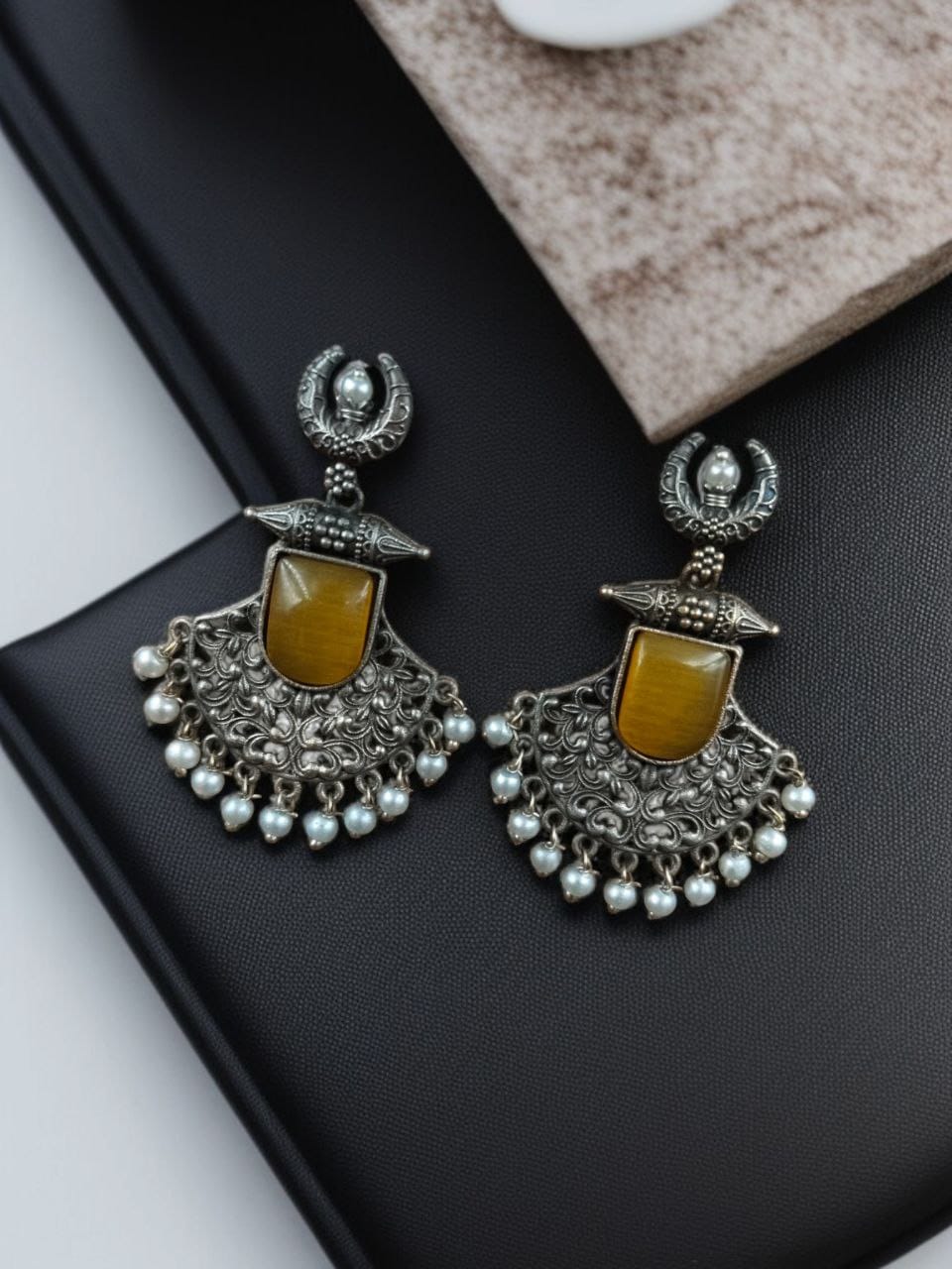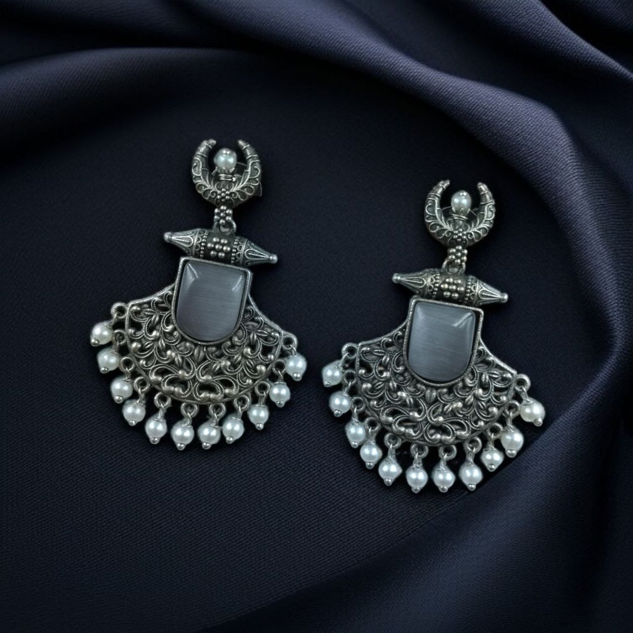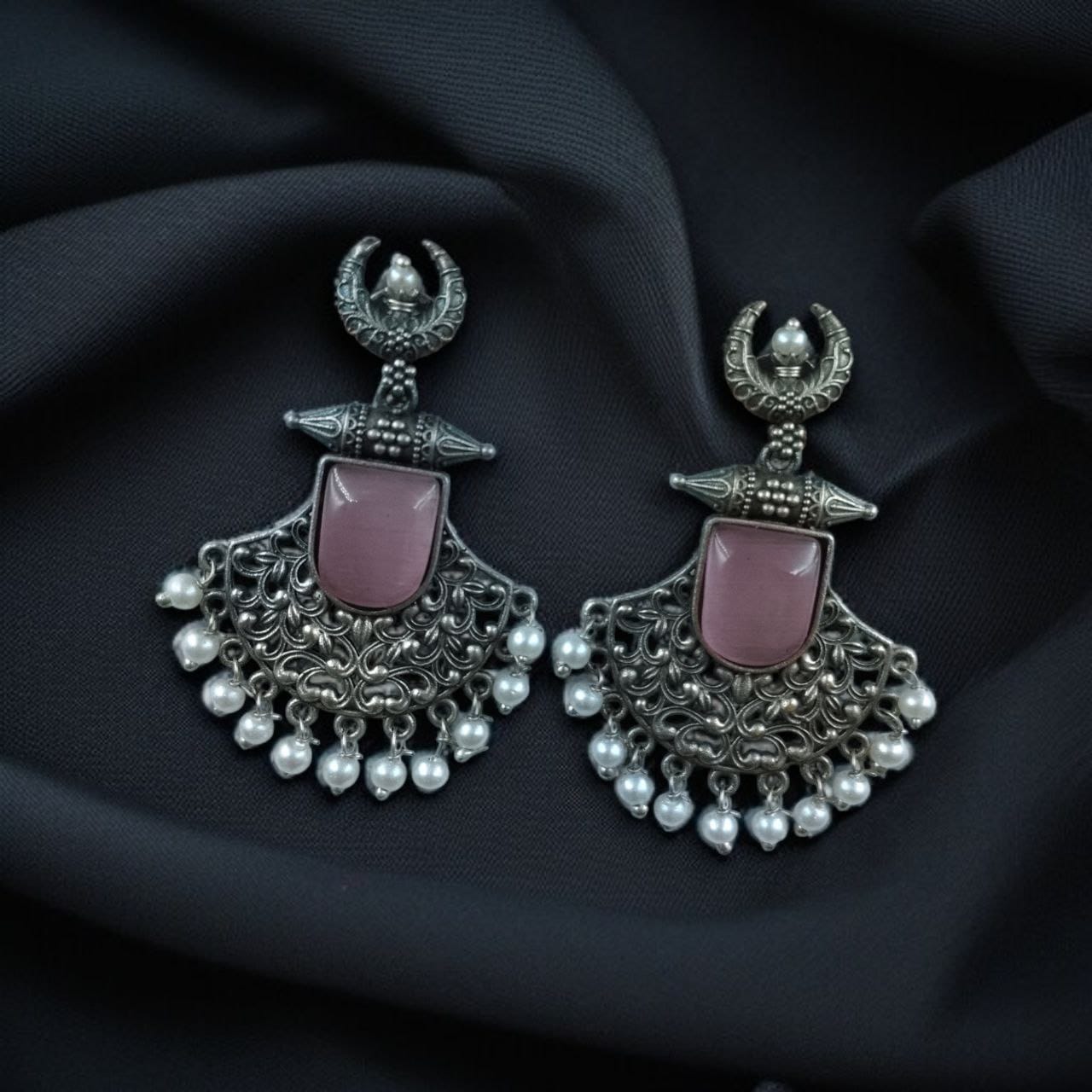 Celebrate tradition with a modern flair. These Silver Replica Oxidized Half Moon Dangler Earrings with Pearl and Floral Design are perfect for women who adore handcrafted jewelry with character and cultural richness.