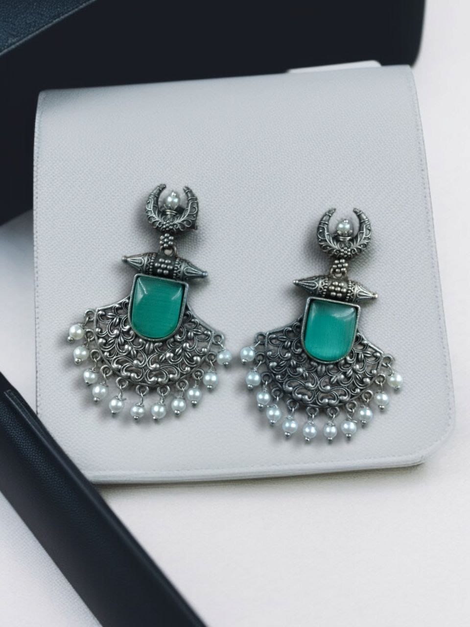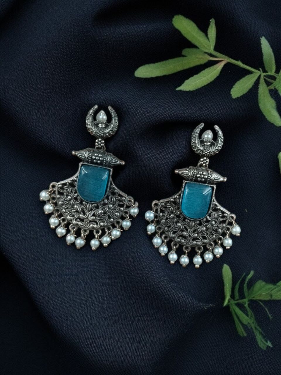 Add an exquisite ethnic touch to your jewelry collection with these Silver Replica Oxidized Half Moon Dangler Earrings with Pearl and Floral Design. Beautifully handcrafted, these Half Moon Dangler Earrings blend tradition and elegance, offering a timeless charm that perfectly complements Indian and Indo-western outfits.