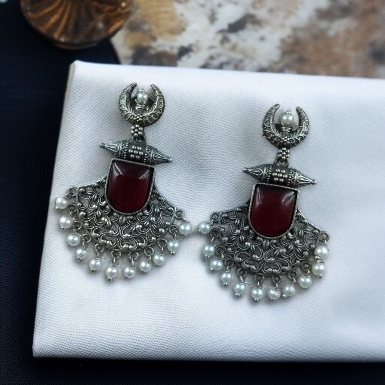 The thoughtful blend of floral detailing, half-moon shape, oxidized silver finish, and pearl embellishments make these Half Moon Dangler Earrings a versatile addition to your wardrobe. They?re not just accessories?they?re a celebration of traditional craftsmanship with a modern edge.