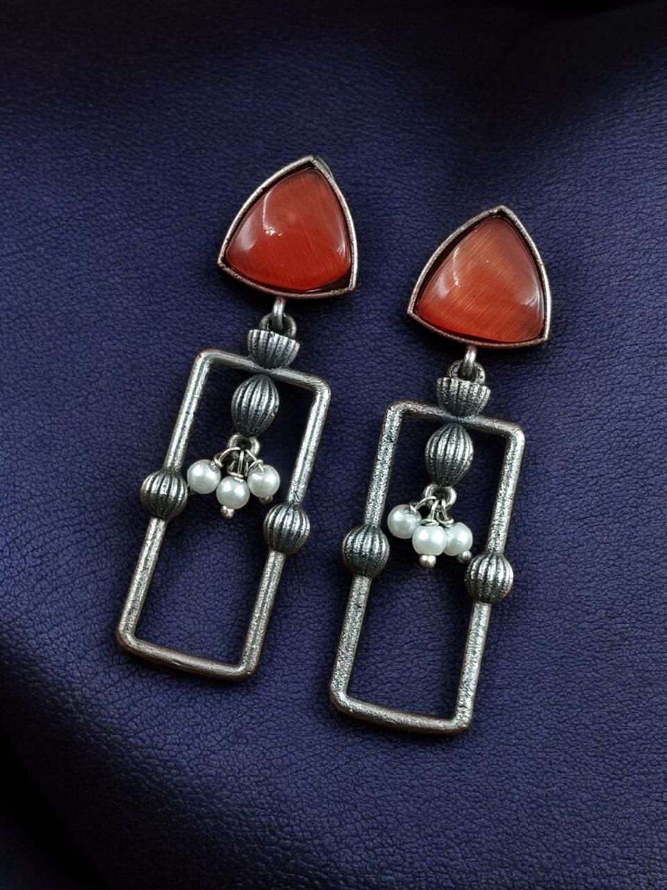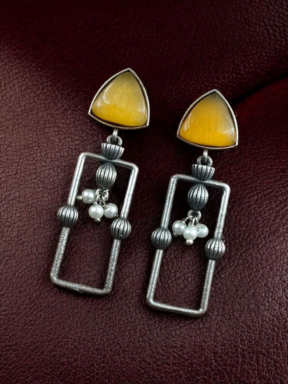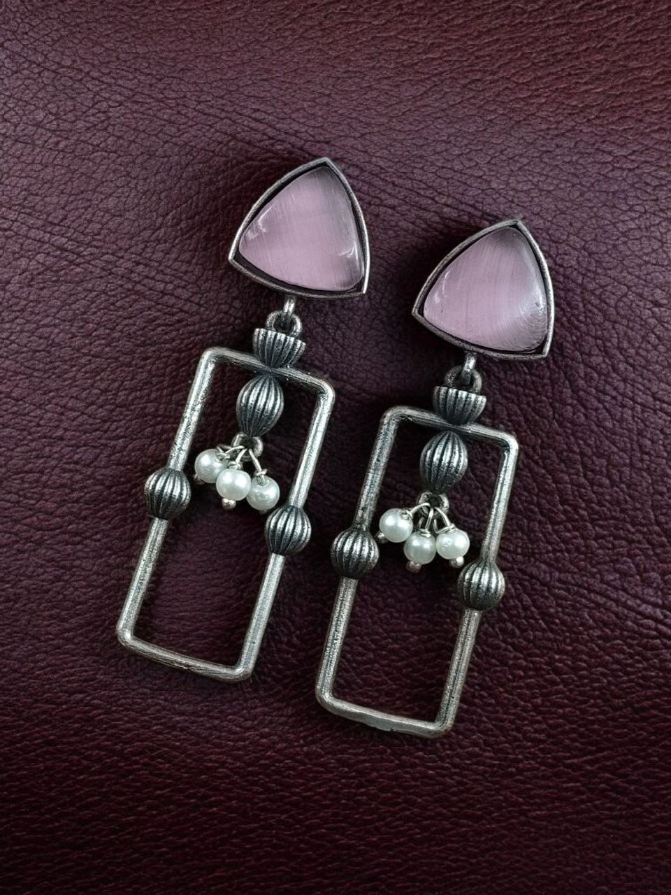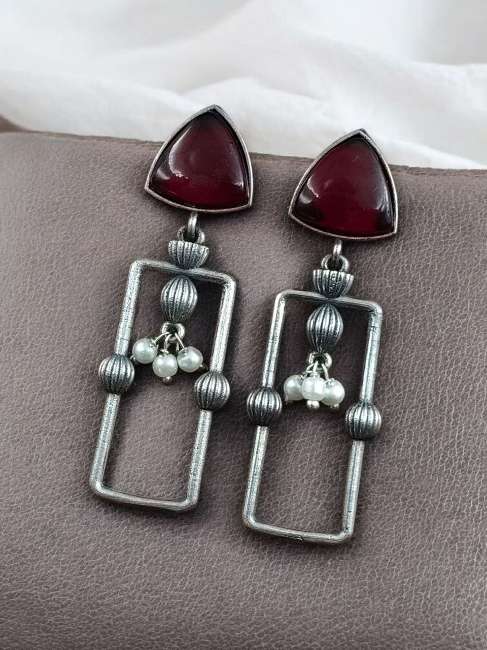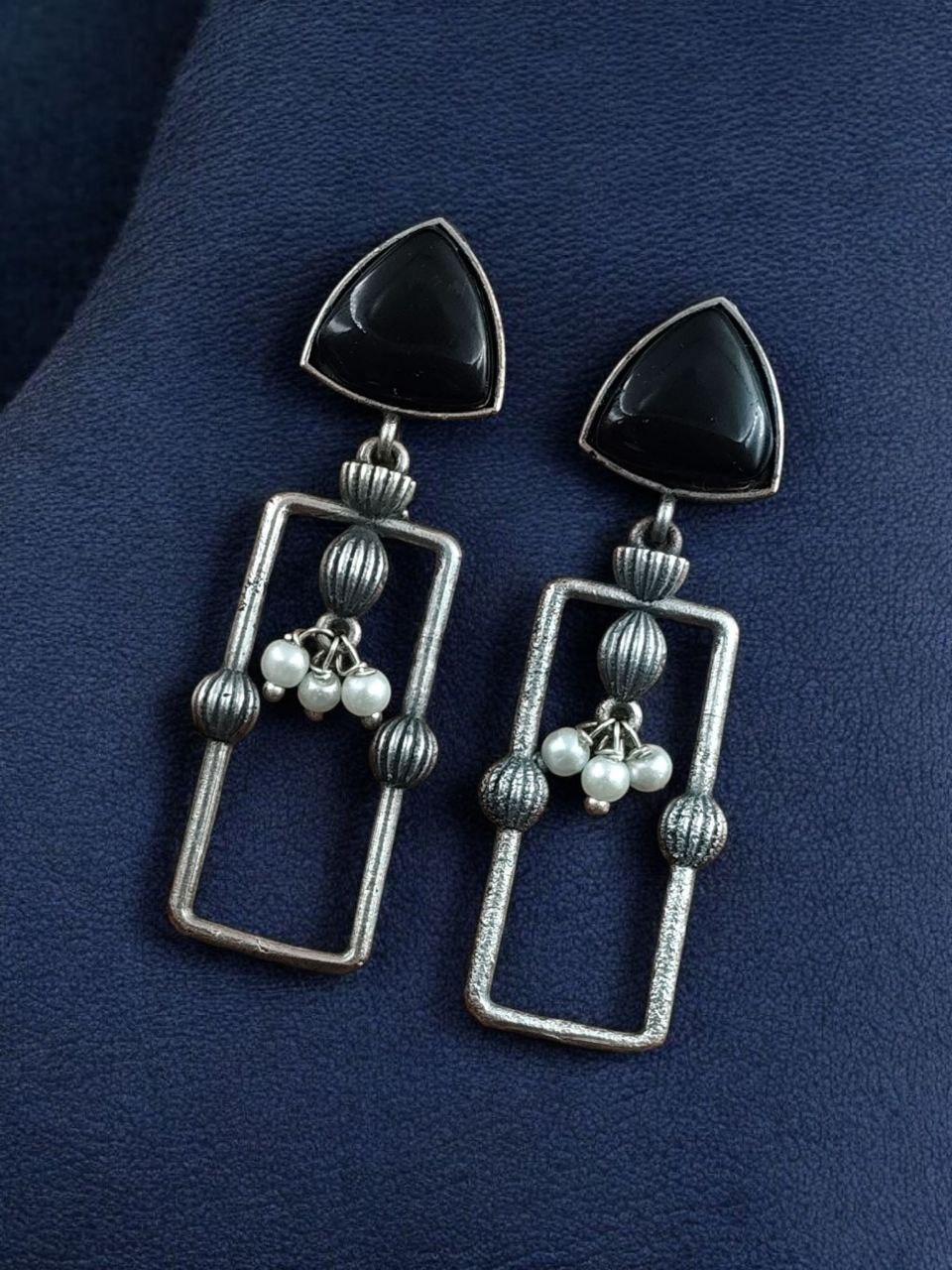 Designed in a silver replica finish, these Geometric Dangler Earrings emulate the luxurious look of antique silver without compromising affordability or comfort. The oxidized touch adds a vintage charm, making them ideal for both ethnic and modern outfits.