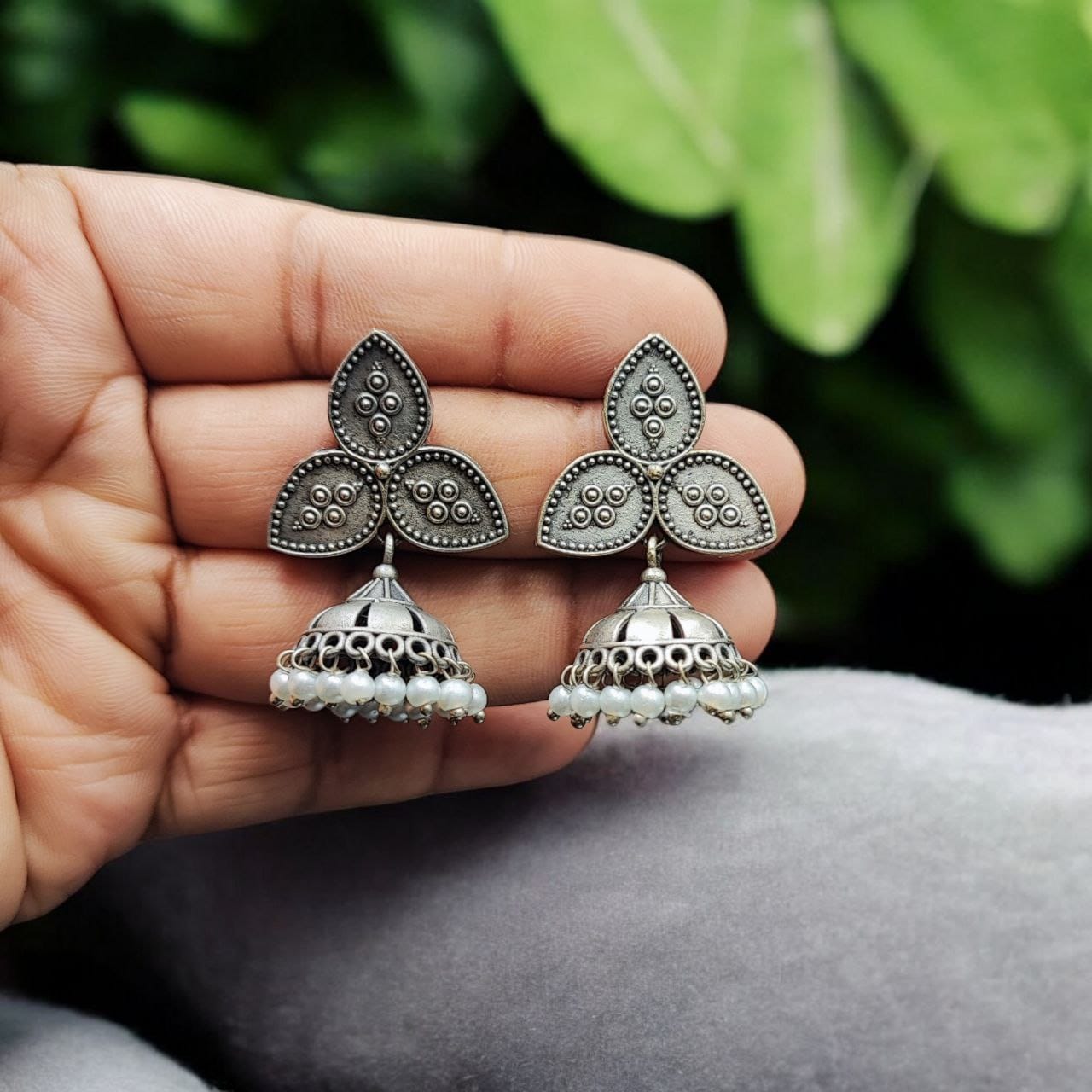 Meticulously crafted, these oxidized jhumka earrings feature a detailed leaf-inspired stud paired with a gracefully hanging silver replica jhumka. The intricate patterns and antique oxidized finish enhance their vintage appeal, while the pearl bead accents add a touch of sophistication.