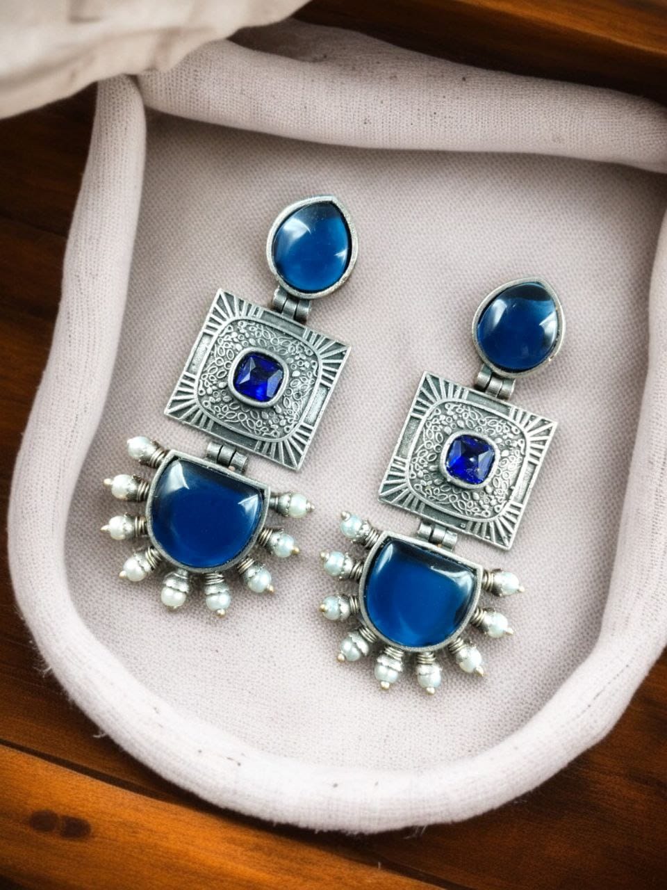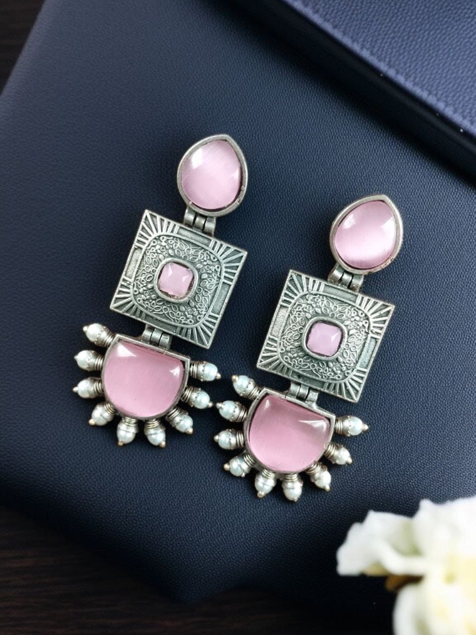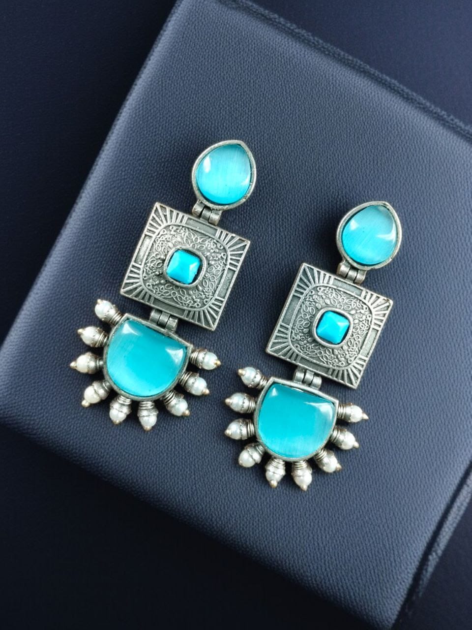 Crafted with high-quality materials, these oxidized silver Square Dangler Earrings feature a stunning square-shaped Monalisa stone at the center, exuding a sophisticated appeal. The intricate detailing is further enhanced with delicate pearl work, adding a graceful touch to the overall design. These dangling earrings for women are a must-have accessory for those who love ethnic and bohemian styles.