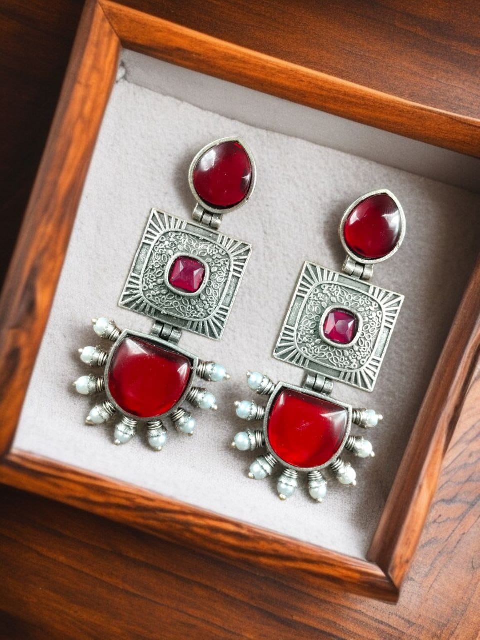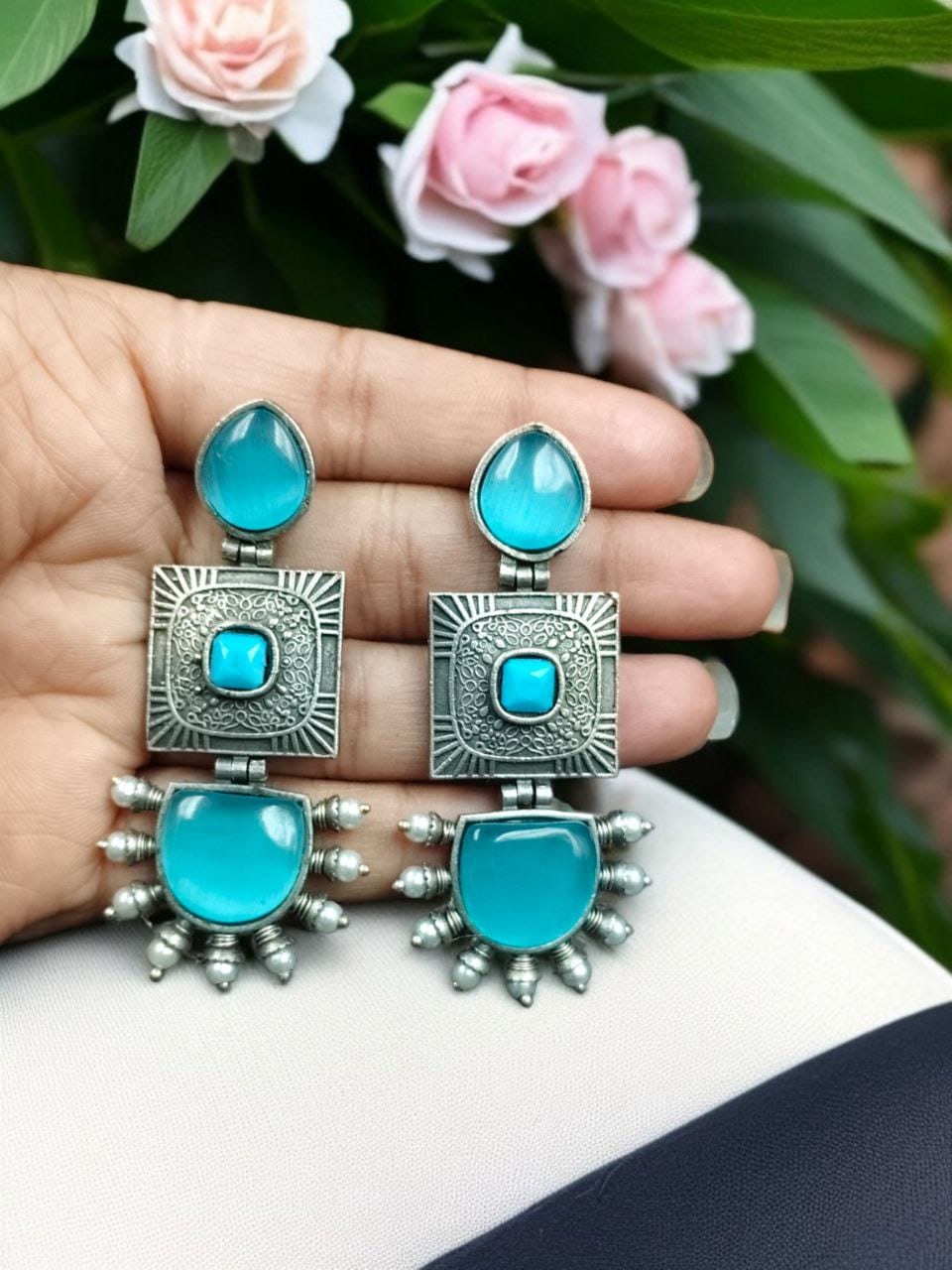 These silver look-alike danglers are designed to complement a wide range of outfits, making them ideal for festive occasions, weddings, and cultural celebrations. Whether paired with a saree, lehenga, or anarkali, these statement Square Dangler Earrings for women add an elegant charm to your attire. Their intricate silver finish gives them a vintage touch, making them perfect for traditional wear.