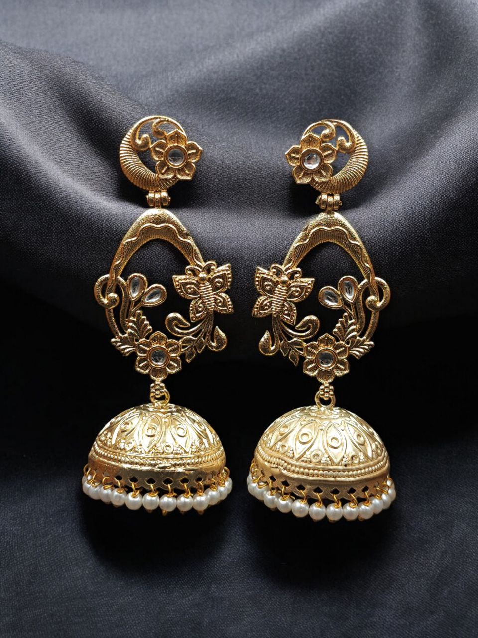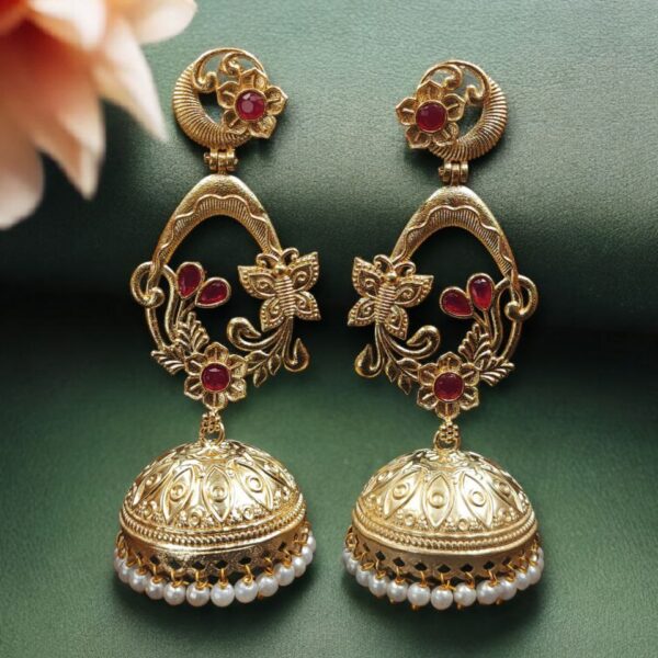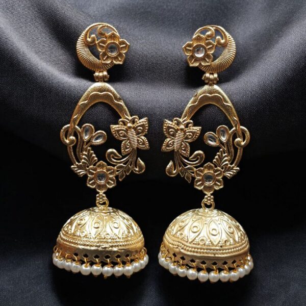 The upper portion features a delicately designed butterfly motif that symbolizes beauty, transformation, and femininity. The intricate detailing adds a refined touch, making the earrings look luxurious and premium. Attached to the butterfly design is a traditional dome-shaped jhumka that reflects timeless cultural heritage. The elegant structure creates a beautiful balance between traditional craftsmanship and contemporary styling.