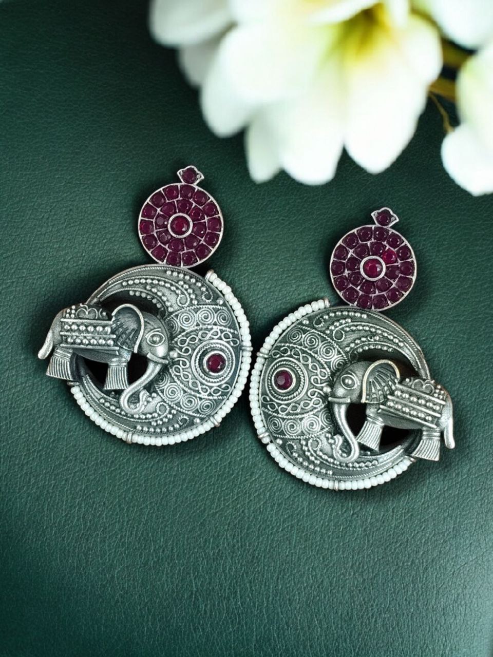 These elephant design earrings pair beautifully with sarees, lehengas, anarkalis, and ethnic suits. Whether styled with bridal outfits or festive ensembles, they instantly elevate your look with a royal and traditional charm. Their unique motif makes them a statement accessory while still maintaining elegance and harmony.