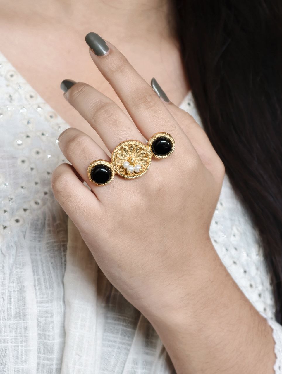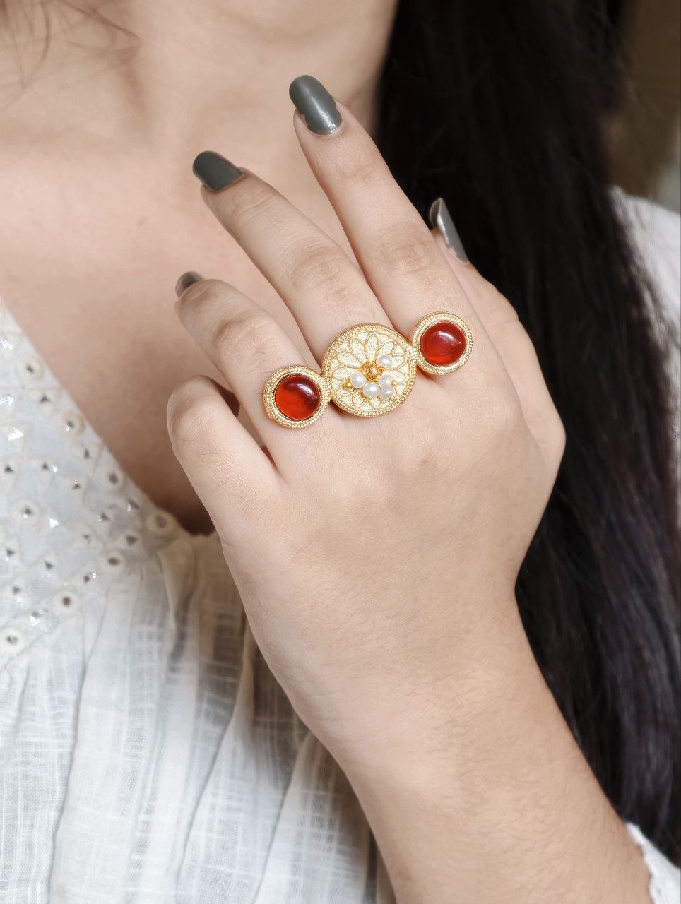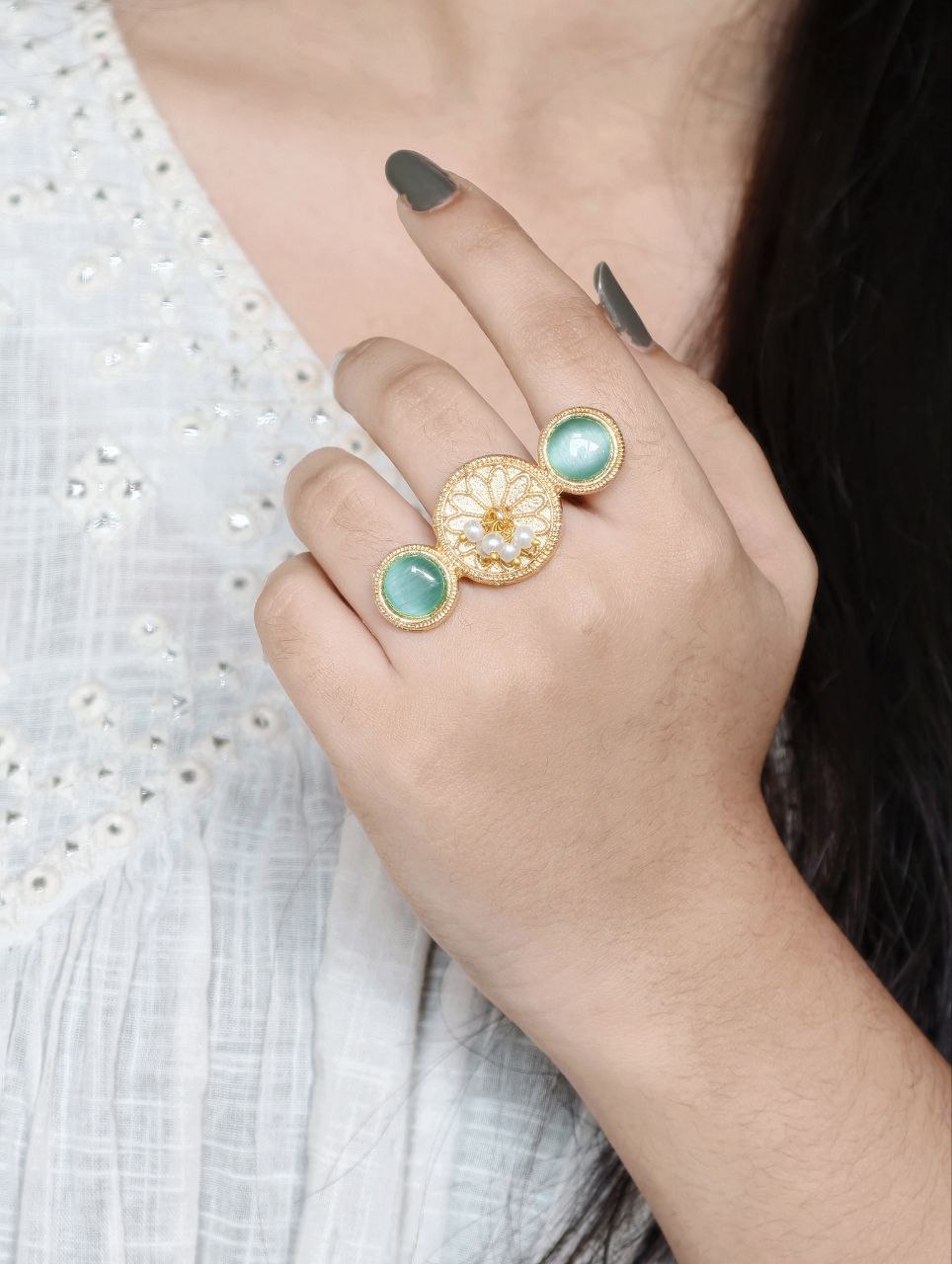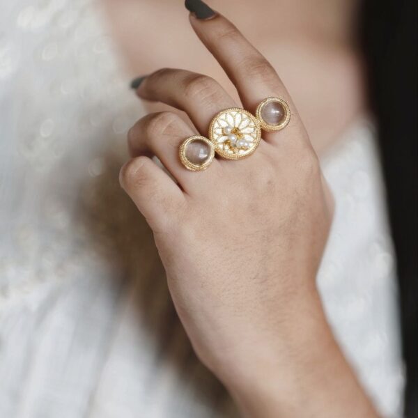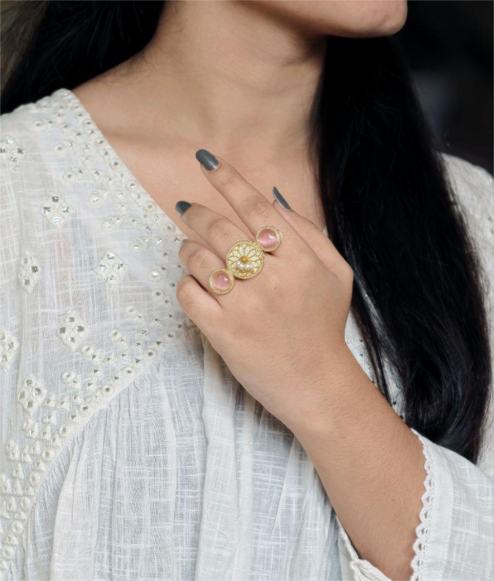 Lightweight and skin-friendly, this ring is ideal for long hours of use without discomfort. Whether paired with sarees, lehengas, kurtis, or fusion wear, it complements a wide range of outfits effortlessly. The warm gold tone combined with the soft shine of pearls and Monalisa stone creates a harmonious blend of tradition and sophistication.