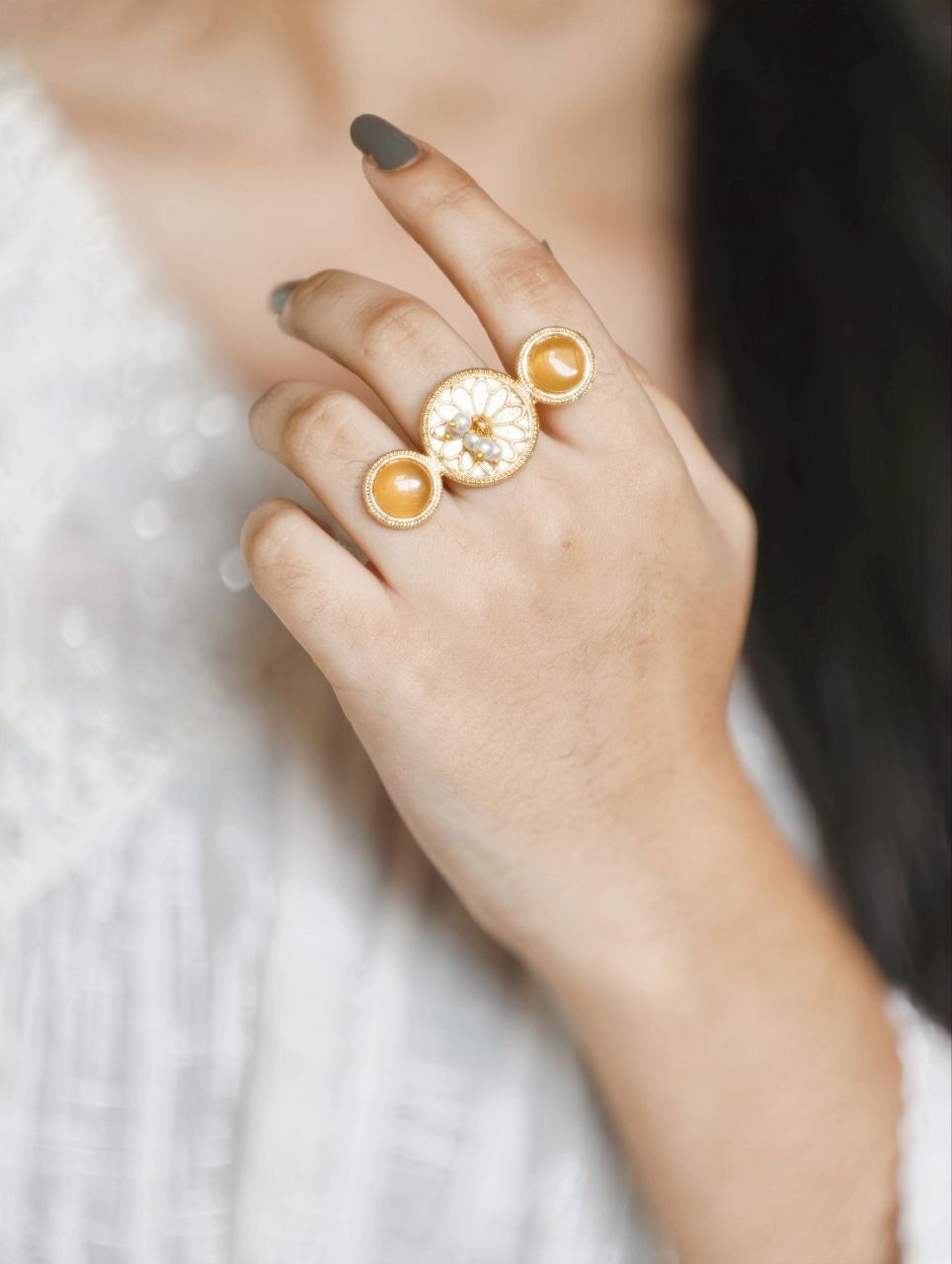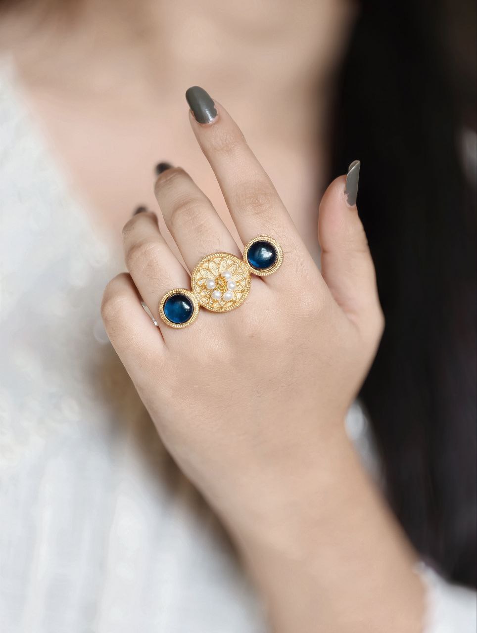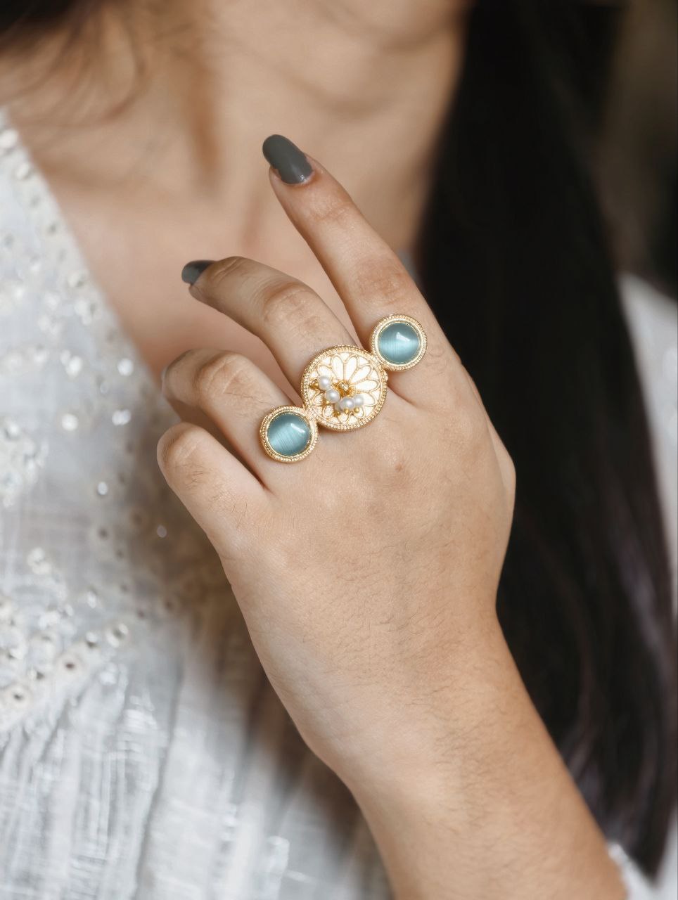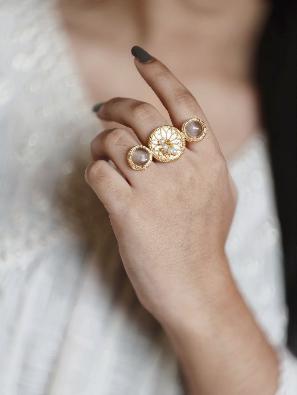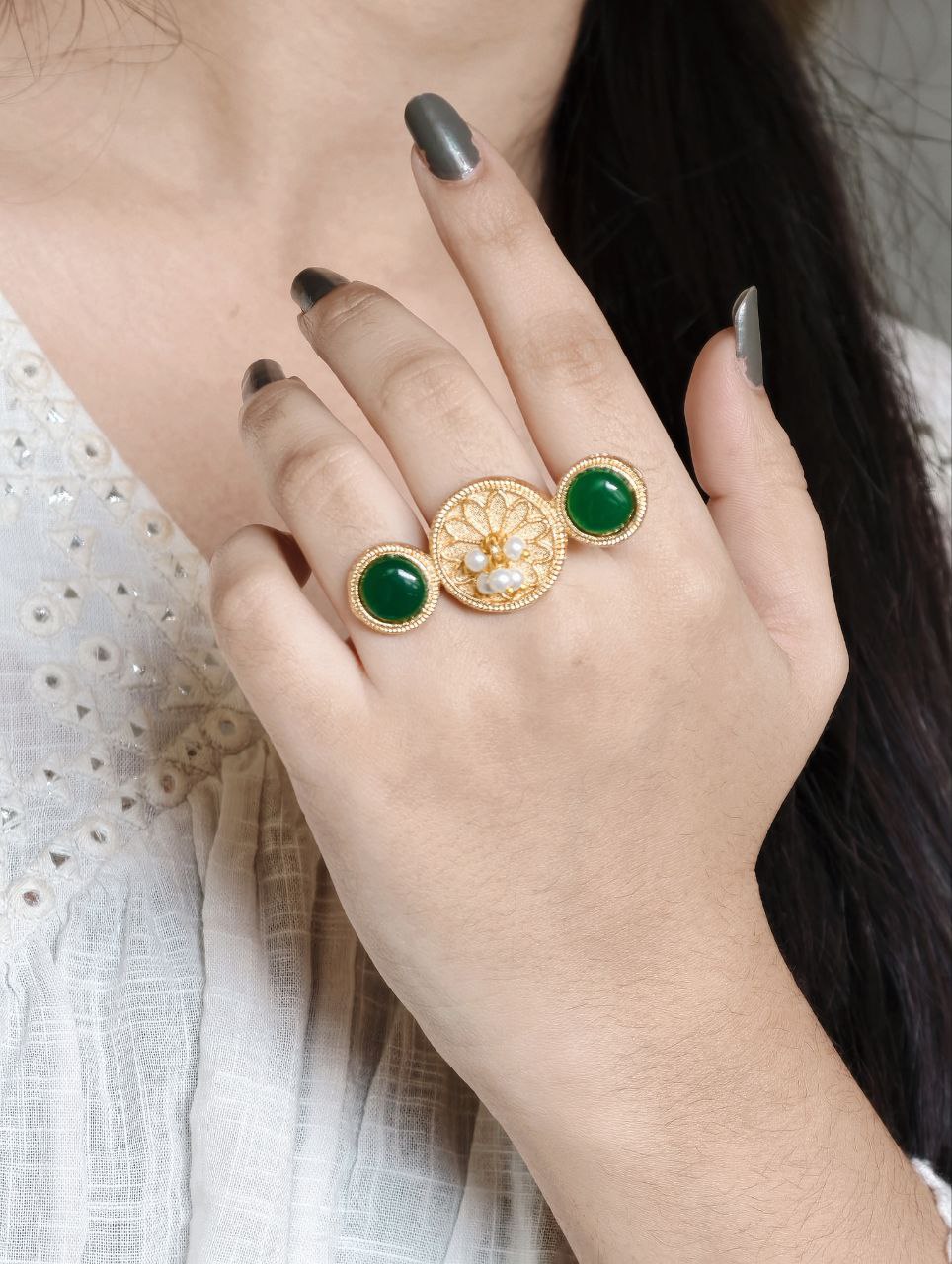 Lightweight and skin-friendly, this ring is ideal for long hours of use without discomfort. Whether paired with sarees, lehengas, kurtis, or fusion wear, it complements a wide range of outfits effortlessly. The warm gold tone combined with the soft shine of pearls and Monalisa stone creates a harmonious blend of tradition and sophistication.
