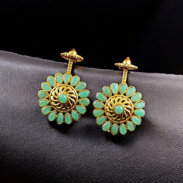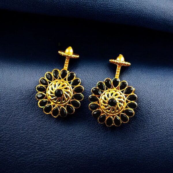 Expertly crafted using high-quality base metal, these earrings are finished with premium gold plating that provides a radiant shine and long-lasting durability. The detailed stone work adds a touch of sparkle and sophistication, enhancing the traditional appeal of the design. Each stone is carefully placed to create a balanced and elegant pattern, making these earrings a standout accessory for ethnic wear.