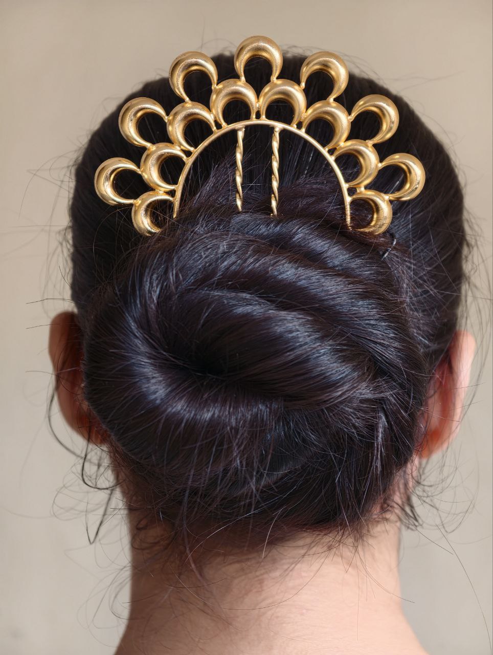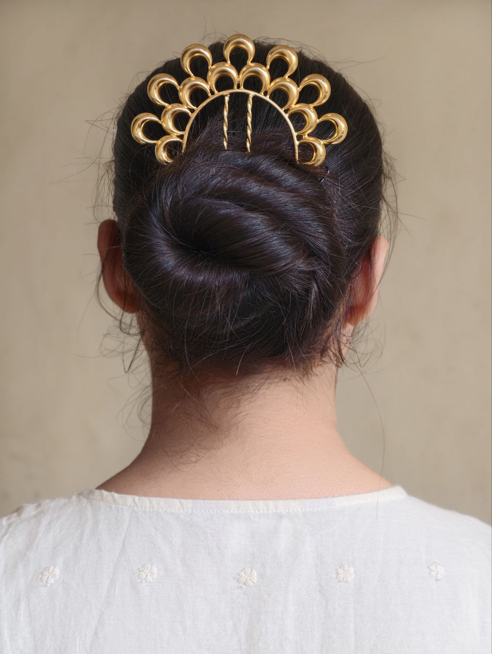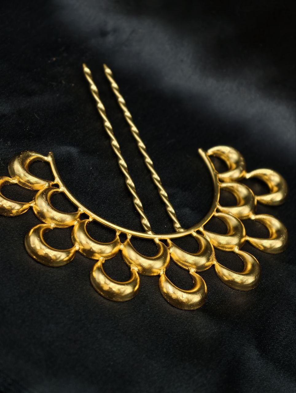 Versatile and timeless, this half moon juda pin suits women of all age groups. Style it with a classic low bun for a traditional look or pair it with a modern bun or braided hairstyle for a fusion touch. Its elegant silhouette allows it to be worn as a statement accessory or combined with other hair jewelry for a more elaborate style.