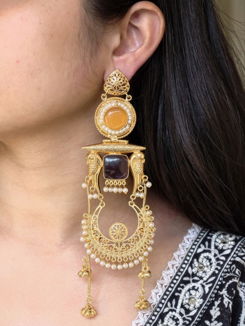 Crafted from high-quality base metal, these Parrot Design Kashmiri Earrings are finished with premium gold plating that gives them a radiant shine and long-lasting durability. The parrot motif symbolizes beauty, joy, and prosperity, and is intricately designed to highlight fine detailing and artistic precision. Soft pearl detailing adds a delicate and refined touch, creating a stunning contrast against the warm gold tone and enhancing the overall visual appeal.