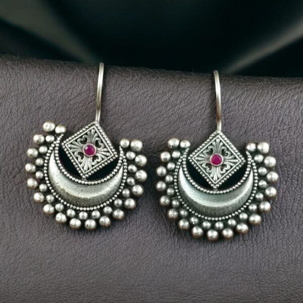 The half-moon design symbolizes beauty and balance, while the delicate stone detailing adds a touch of sparkle that enhances their overall appeal. Crafted with precision by skilled artisans, each piece reflects fine craftsmanship and attention to detail. The oxidized silver finish gives the earrings a rustic antique allure, making them ideal for pairing with both festive and casual outfits.