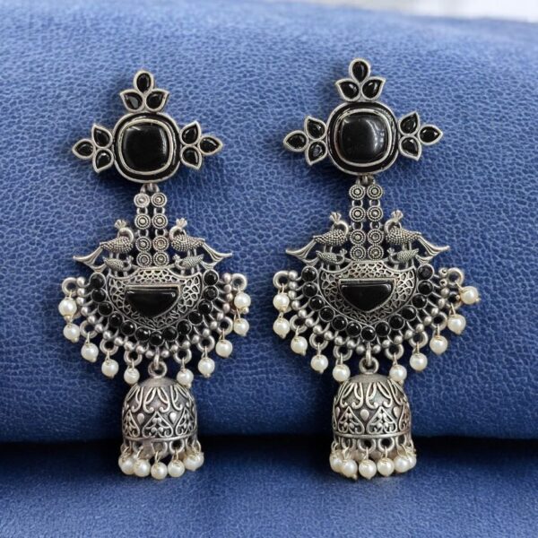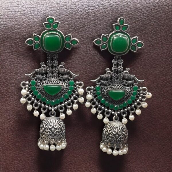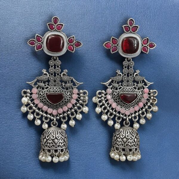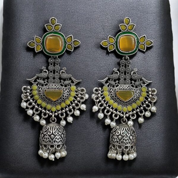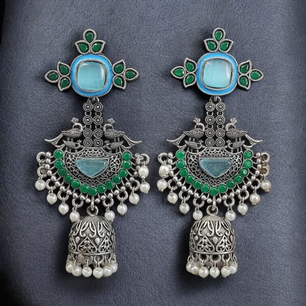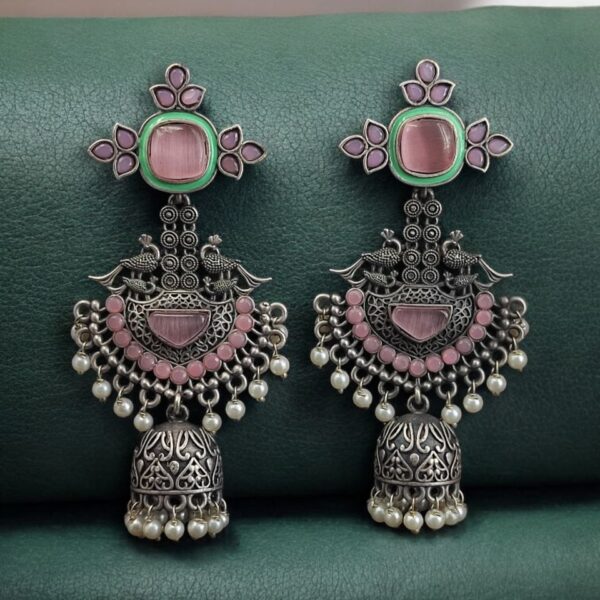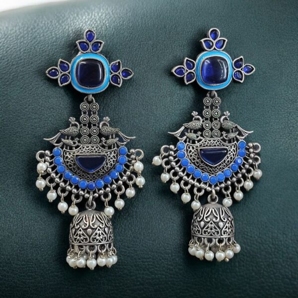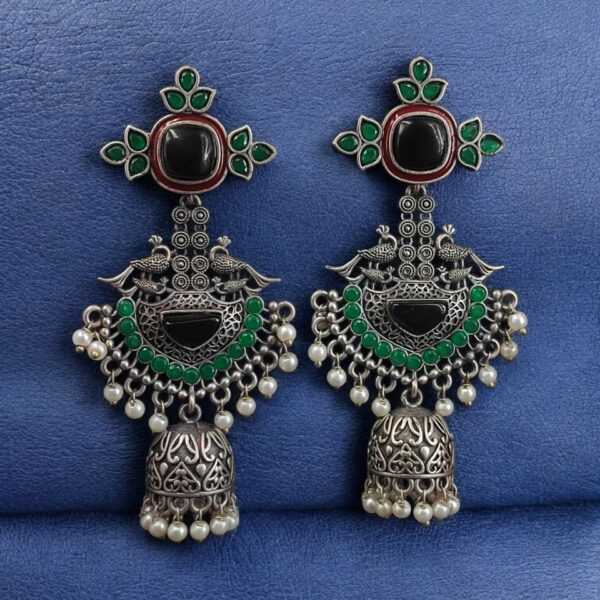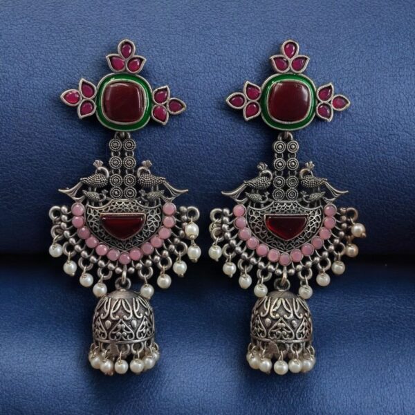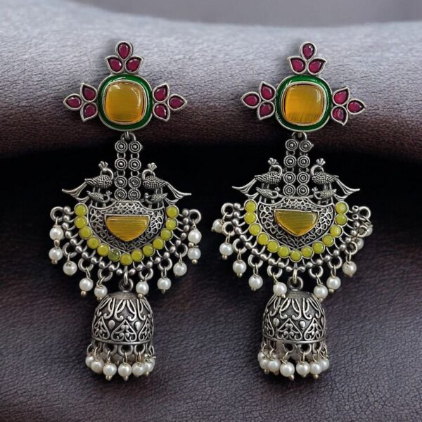 The traditional silver replica base gives the earrings an antique ethnic charm, while the colorful meenakari work adds a royal touch that stands out beautifully. The combination of stone sparkle and pearl softness creates a perfect balance between glamour and tradition.
