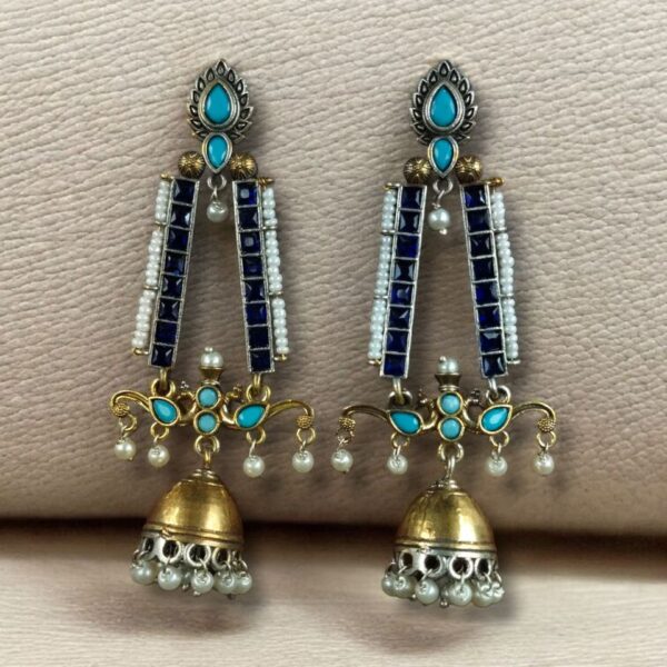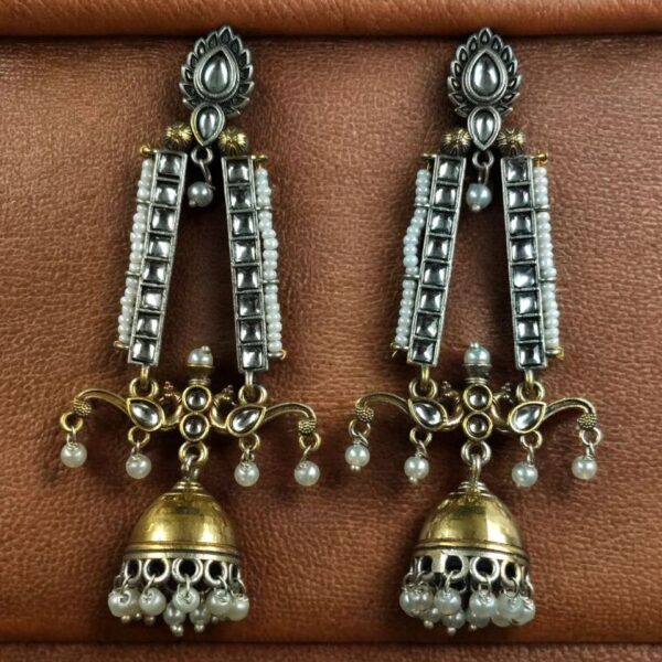 Crafted with premium-quality materials, these Two-Tone Jhumki Earrings are lightweight and comfortable to wear for extended hours. The stone work sparkles beautifully under light, making them an eye-catching accessory, while the pearl beads add movement and elegance with every step you take. Their long dangler structure gives your look a graceful elongation, enhancing both ethnic and fusion outfits.