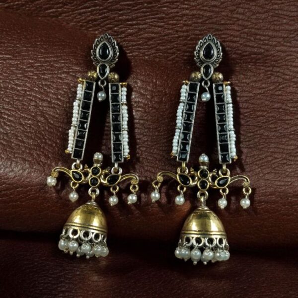 The two-tone finish gives these Two-Tone Jhumki Earrings a unique appeal, combining both golden and oxidized hues to make them versatile for various occasions. The intricate design highlights the detailed craftsmanship, while the addition of pearls lends a classic touch of sophistication. Whether you?re dressing up for a wedding, festive celebration, or a traditional gathering, these earrings are sure to elevate your overall ensemble.