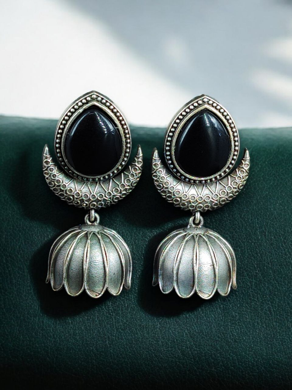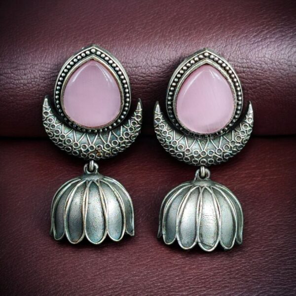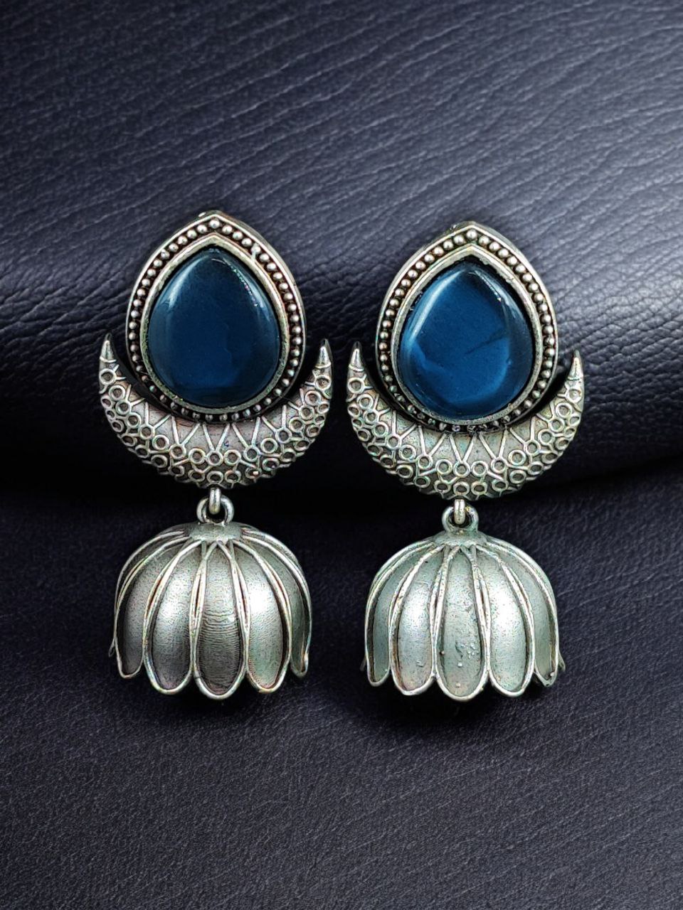 Made from high-quality base metal, these earrings are coated with a premium oxidized silver replica finish that gives them an antique and royal appearance. The intricate jhumka design is inspired by traditional Indian motifs, while the Monalisa stone adds a subtle glow and refined elegance to the overall look. Each stone is carefully set to ensure durability and balanced beauty, making these Oxidized a true statement accessory.