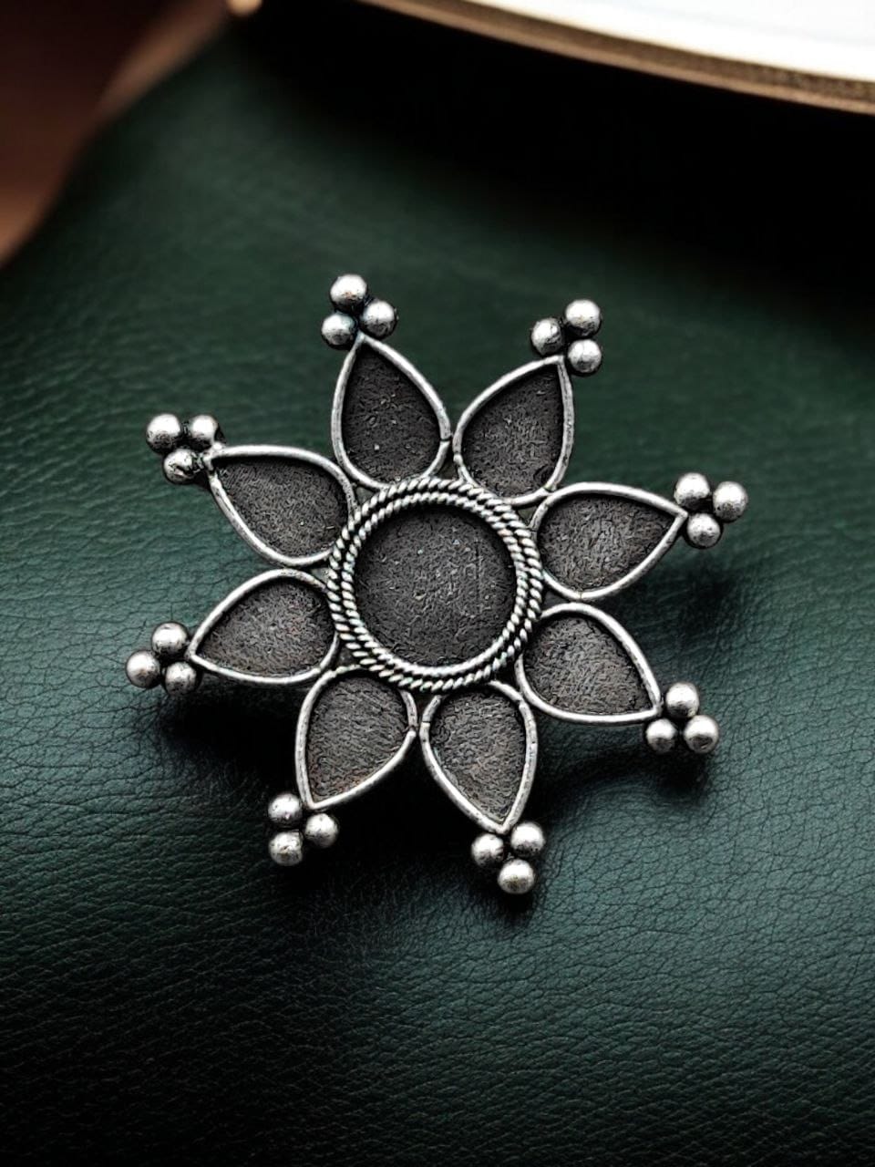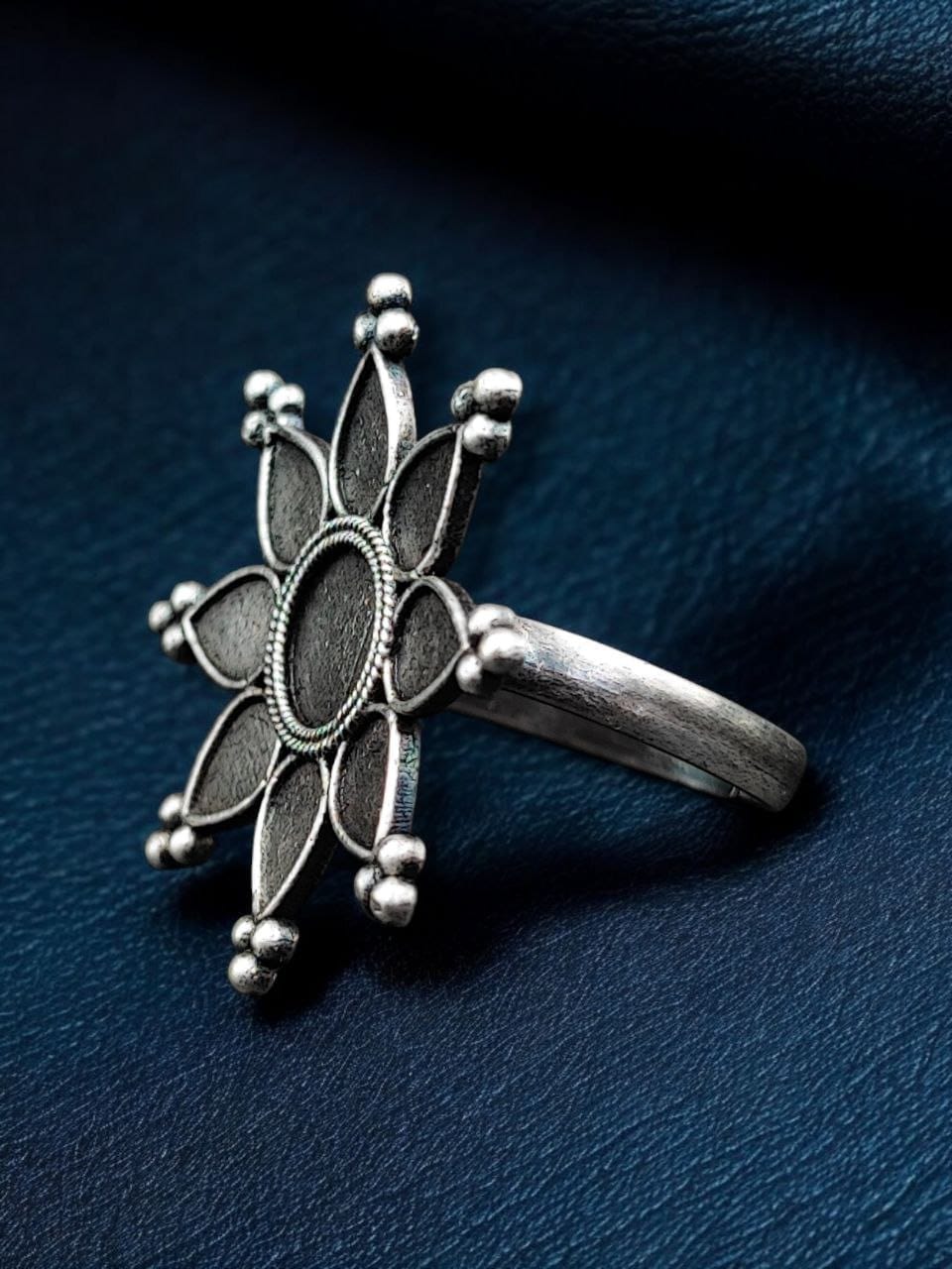 The ring features a beautiful design inspired by traditional Indian jewelry, enhanced with intricate patterns and an oxidized silver-like finish. The detailing reflects a vintage charm, while the silver replica material gives it a premium and authentic appearance. Whether for a cultural celebration or everyday wear, this Oxidized Rings adds a touch of heritage and sophistication to any outfit.