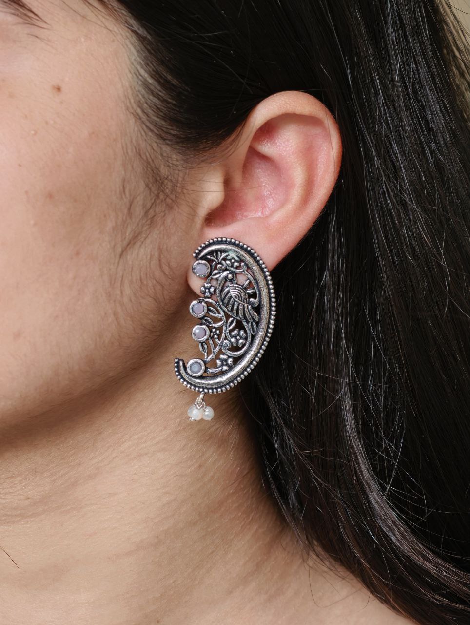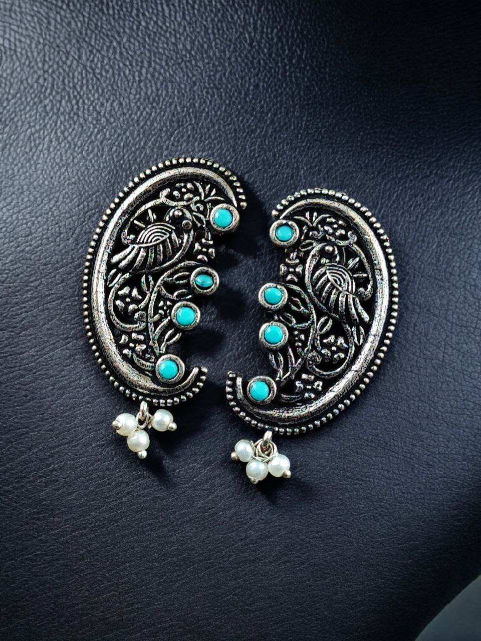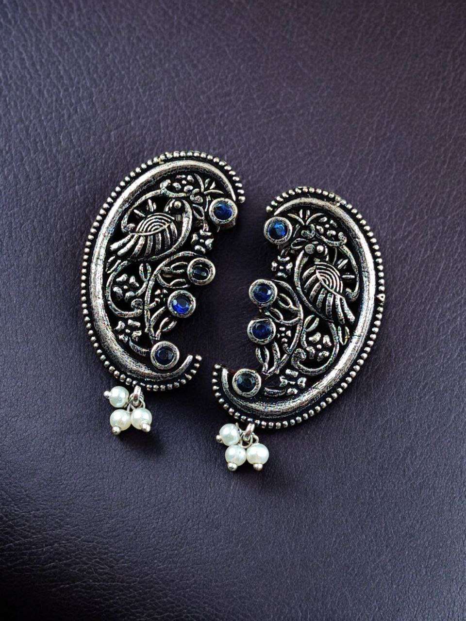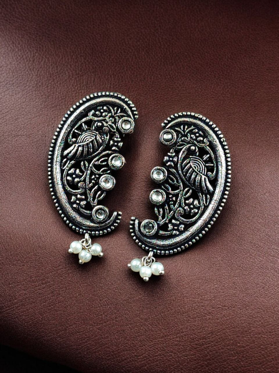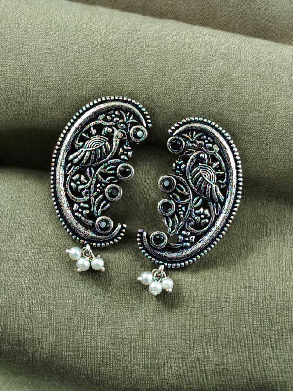 The earrings feature a beautifully detailed peacock motif, a symbol of grace, prosperity, and divine beauty in Indian tradition. The peacock design is enhanced with intricate floral art patterns, giving the earrings depth and artistic charm. Carefully set stones add a subtle sparkle, while delicate pearl detailing brings softness and elegance to the overall design. The oxidized finish highlights every curve and detail, offering a rich antique look that closely resembles handcrafted silver jewelry.