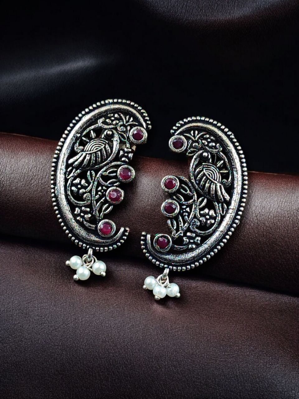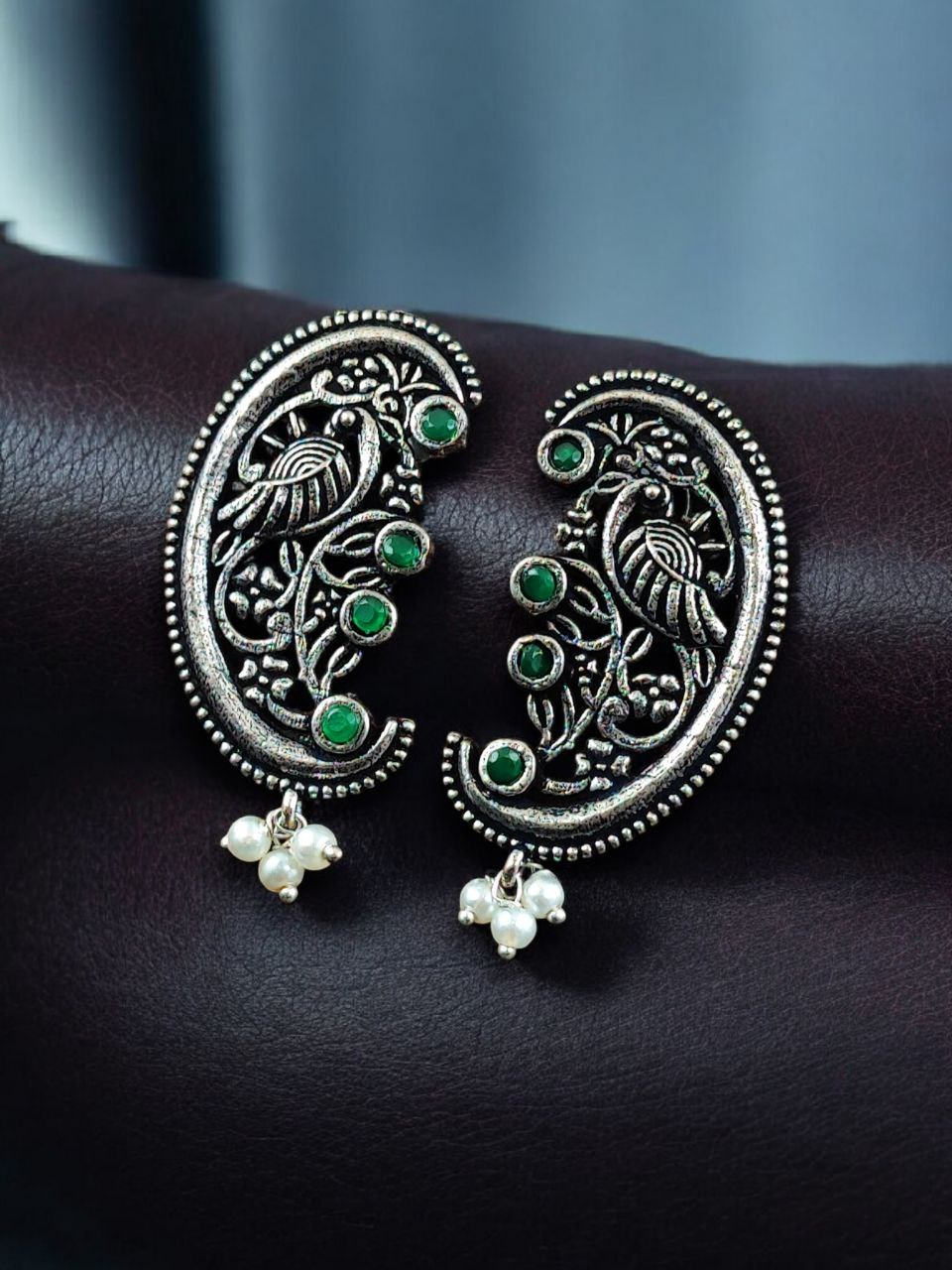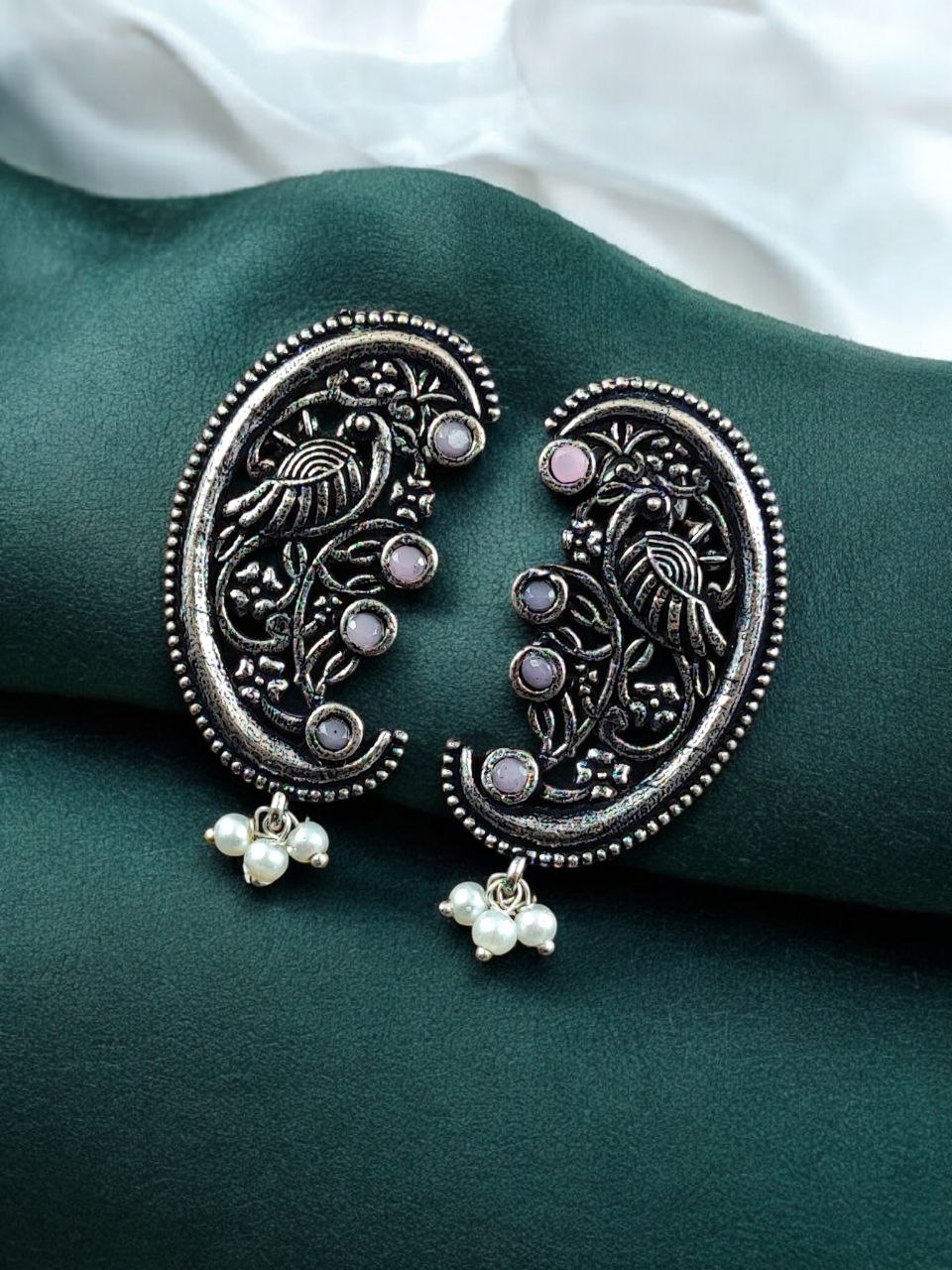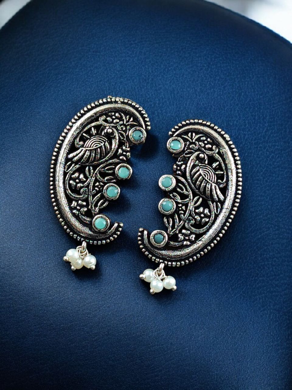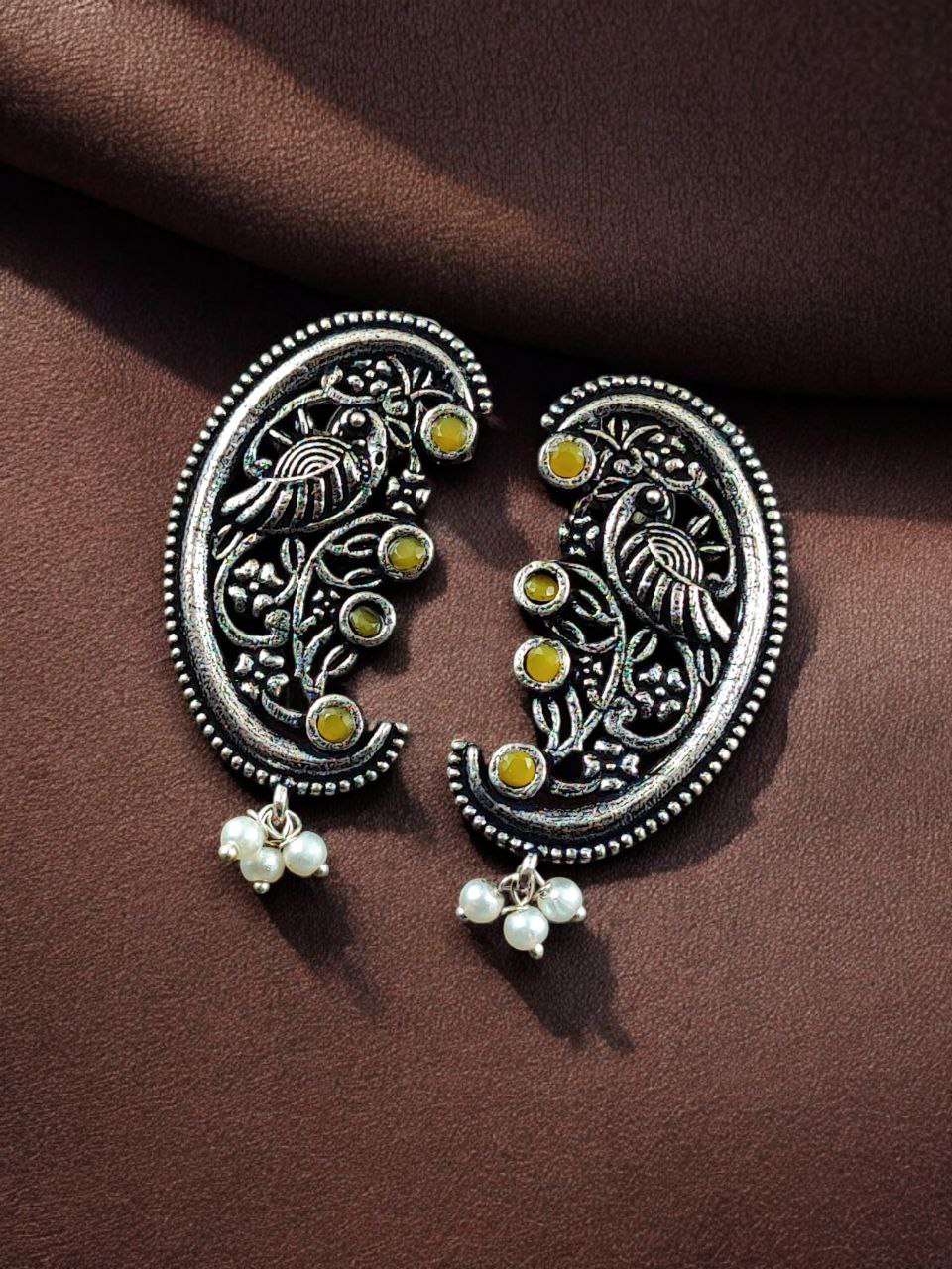 The earrings feature a beautifully detailed peacock motif, a symbol of grace, prosperity, and divine beauty in Indian tradition. The peacock design is enhanced with intricate floral art patterns, giving the earrings depth and artistic charm. Carefully set stones add a subtle sparkle, while delicate pearl detailing brings softness and elegance to the overall design. The oxidized finish highlights every curve and detail, offering a rich antique look that closely resembles handcrafted silver jewelry.