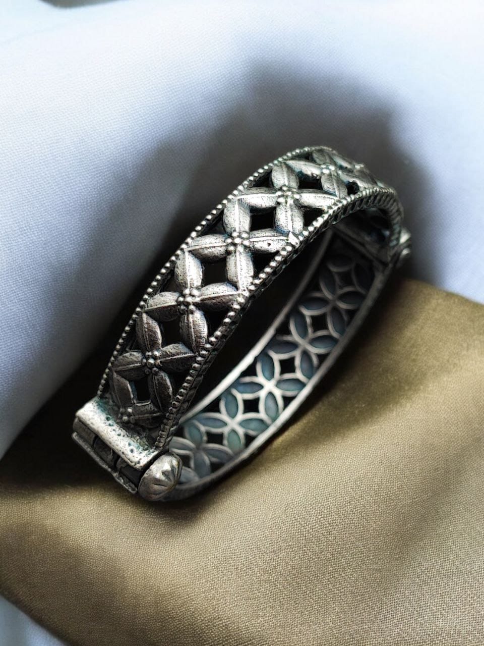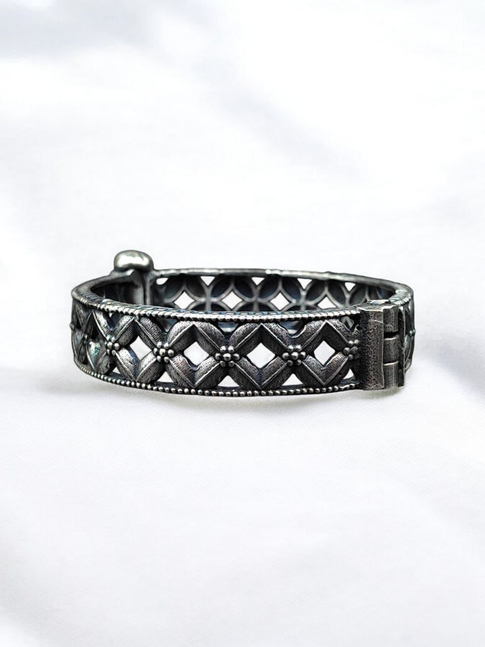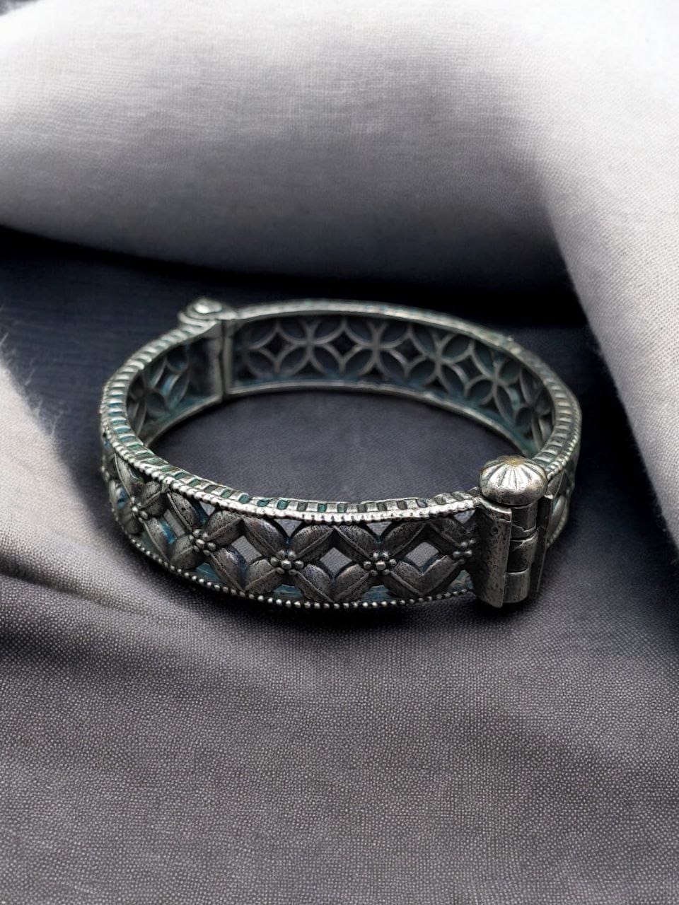 Elevate your jewelry collection with our Traditional Silver Kada, a beautifully crafted piece that blends traditional elegance with contemporary design. Perfect for gifting or treating yourself, this oxidised flower design bracelet adds a touch of sophistication to any outfit. Shop now to experience the timeless beauty of this exquisite kada.