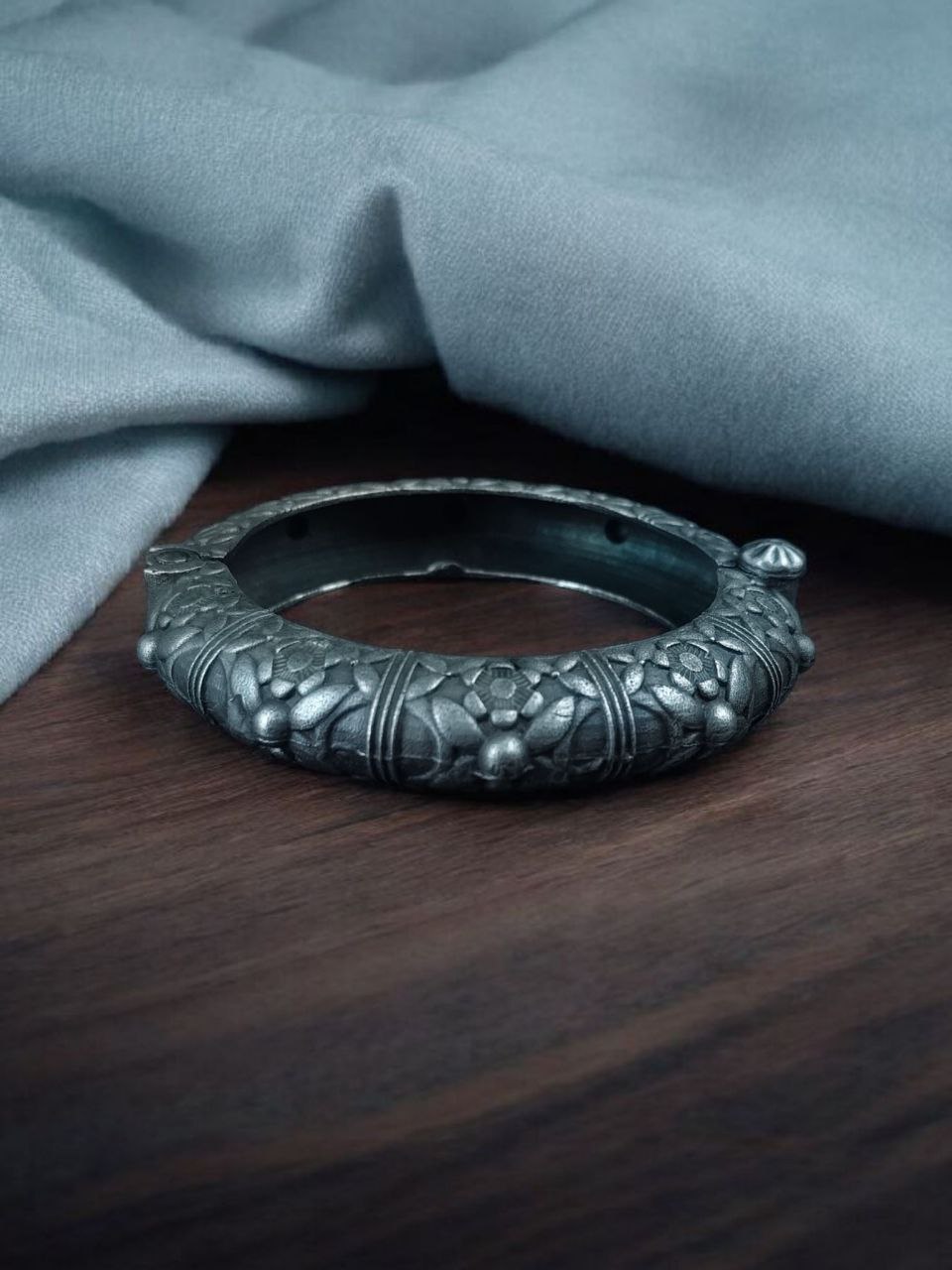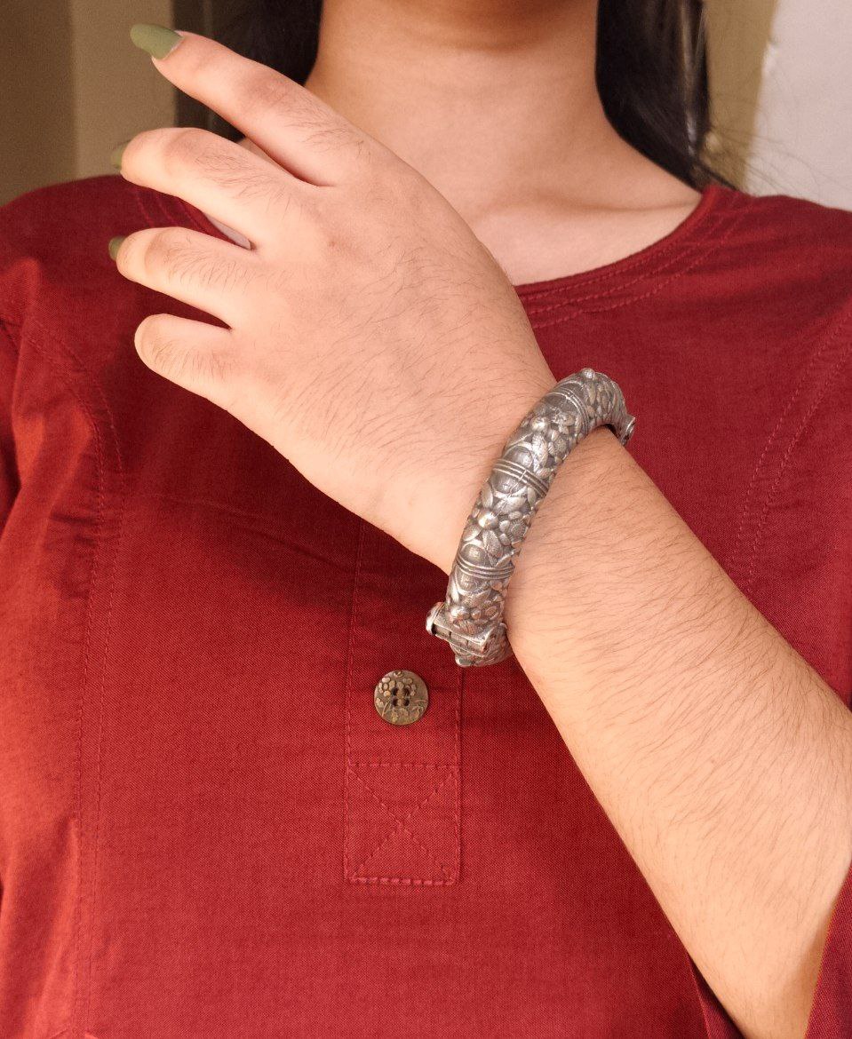 Whether paired with sarees, lehengas, or even fusion wear, these ethnic silver replica bangles enhance your look instantly. The detailed craftsmanship reflects a perfect blend of traditional artistry and contemporary style. Each bangle is carefully polished to highlight the flower patterns, giving it a refined and sophisticated finish that catches attention.
