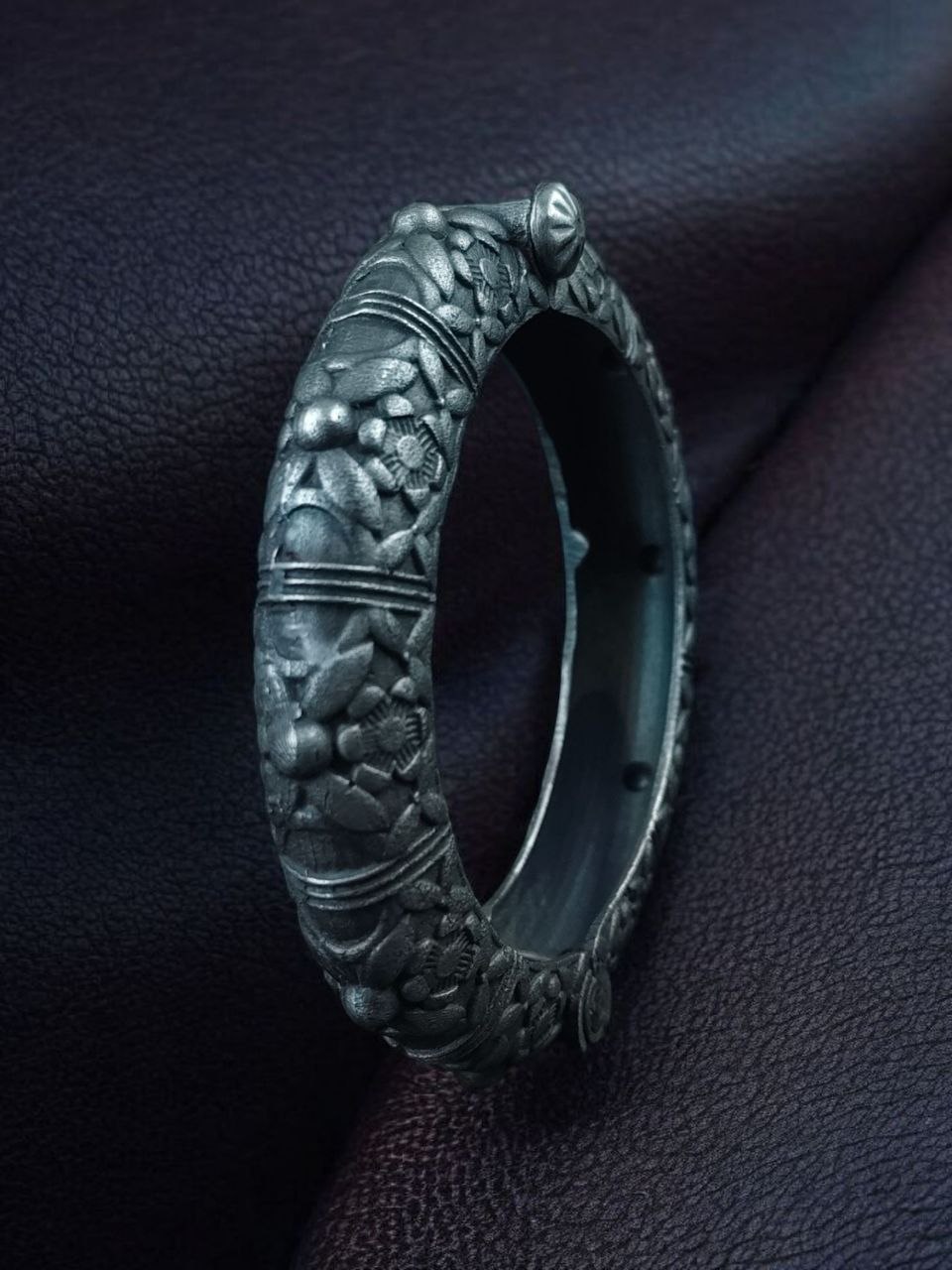 These silver replica bangles are lightweight yet sturdy, ensuring long-lasting use without compromising on elegance. The openable design makes them easy to wear and adjust to fit various wrist sizes, offering convenience without sacrificing aesthetic appeal. The delicate floral art on these oxidized bangles adds a vintage touch, making them stand out among modern jewelry designs while complementing traditional attire beautifully.