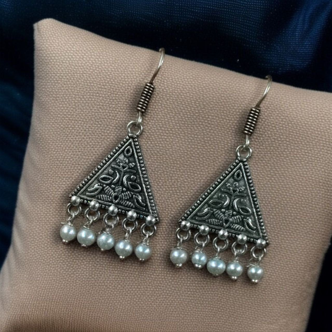 Crafted from high-quality metal with a traditional oxidised finish, these Triangle Hook Earrings feature a distinctive triangle-shaped dangler design that adds a geometric edge to your style. The highlight of each earring is the delicate floral motif etched into the surface, reflecting the intricate artistry inspired by traditional Indian jewelry. At the base, a single luminous pearl dangles gracefully, lending a soft feminine touch and enhancing the overall elegance of the piece.
