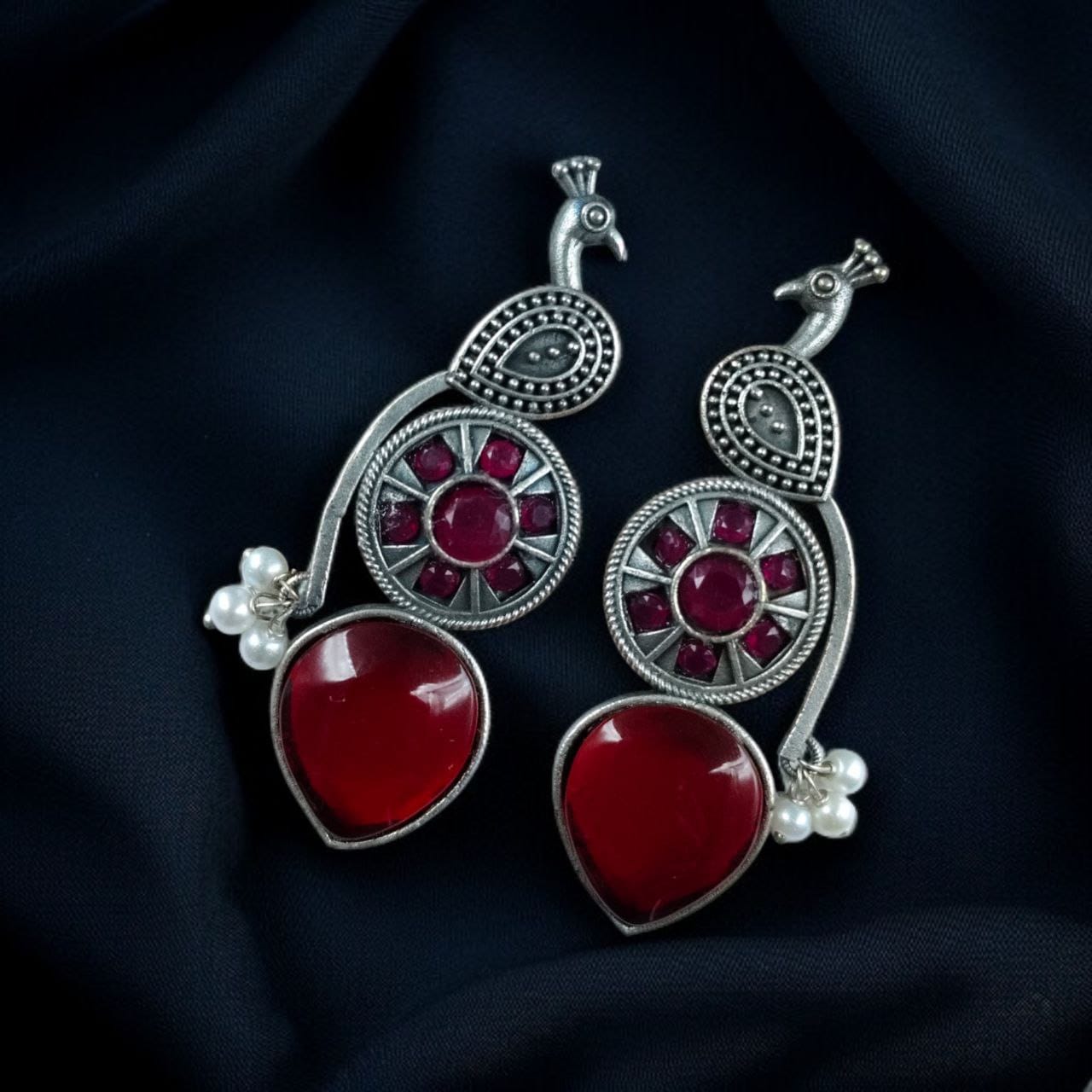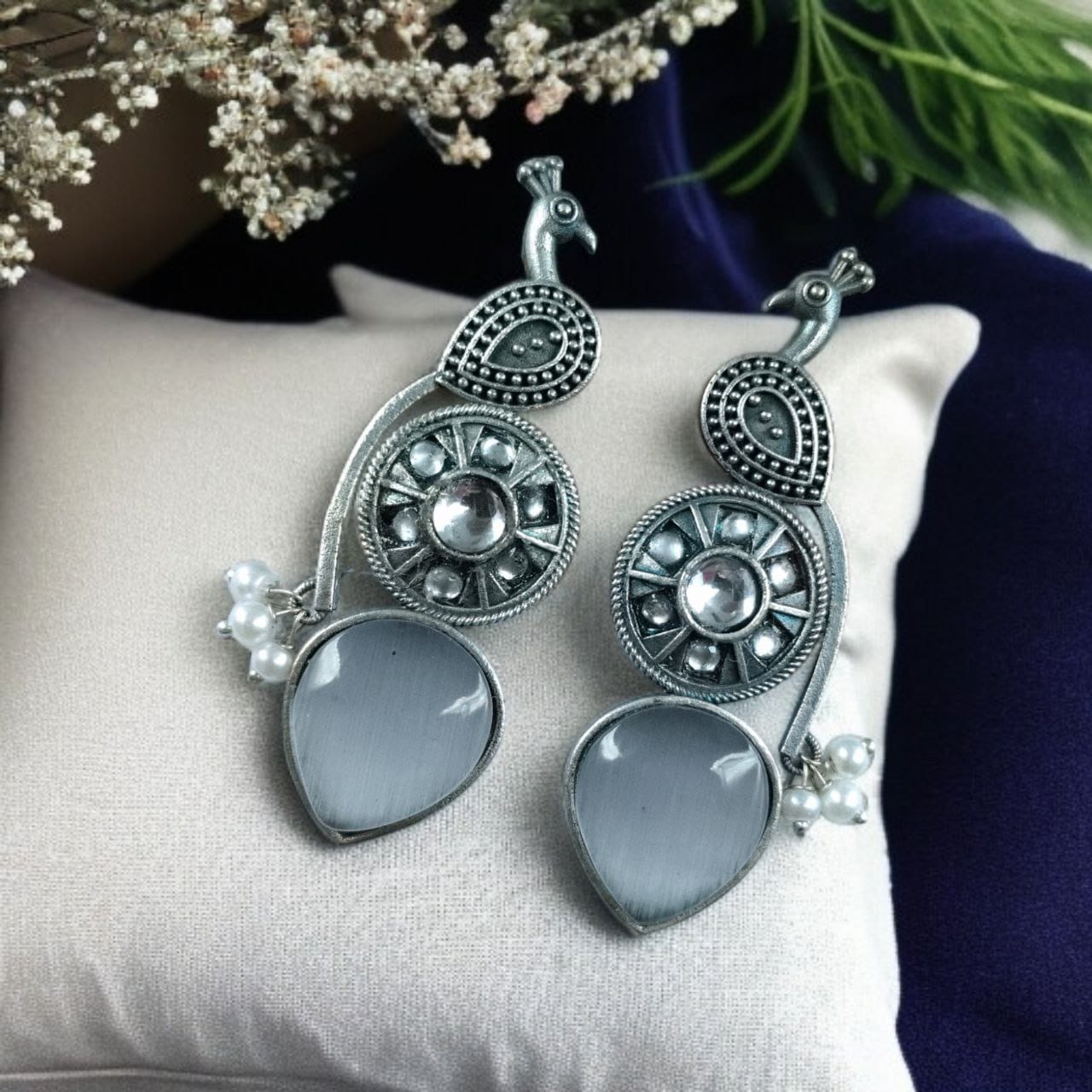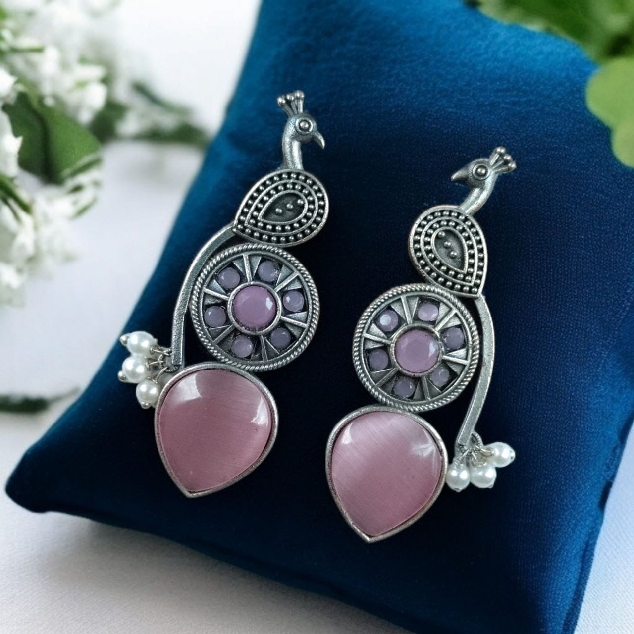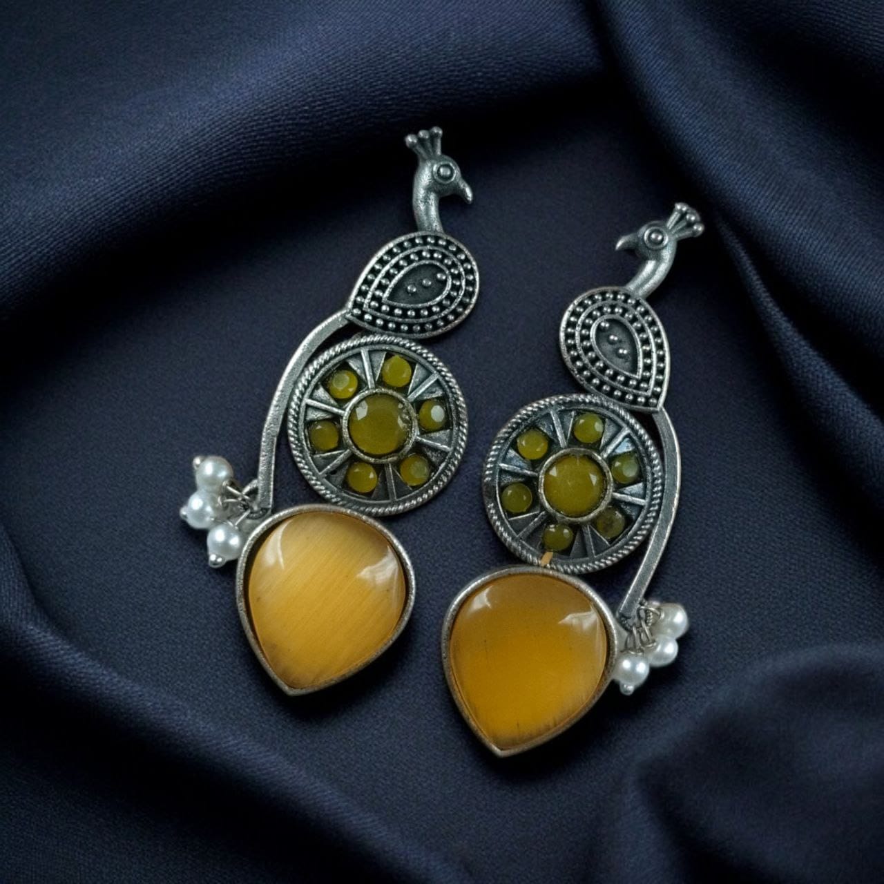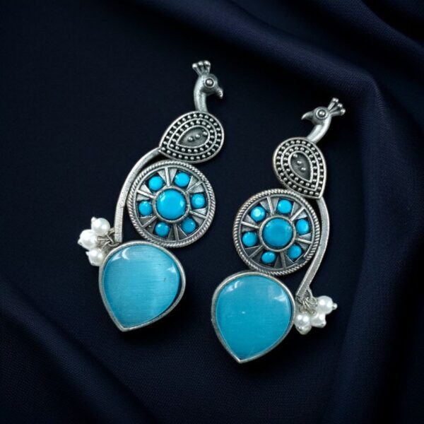 Celebrate your love for culture and artistry with these Traditional Peacock Design Earrings in Oxidized Silver with Monalisa Stone and Pearl?a perfect blend of tradition, elegance, and sophistication. Add these to your collection and make every outfit feel a little more special.