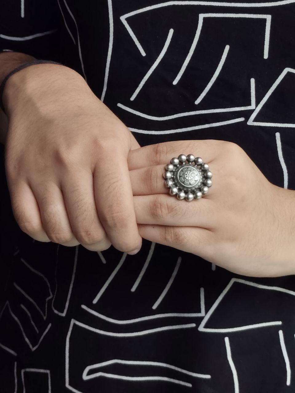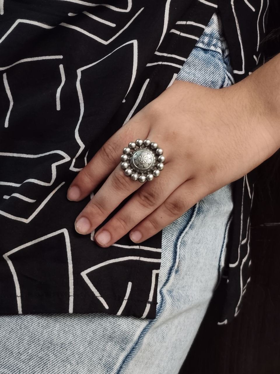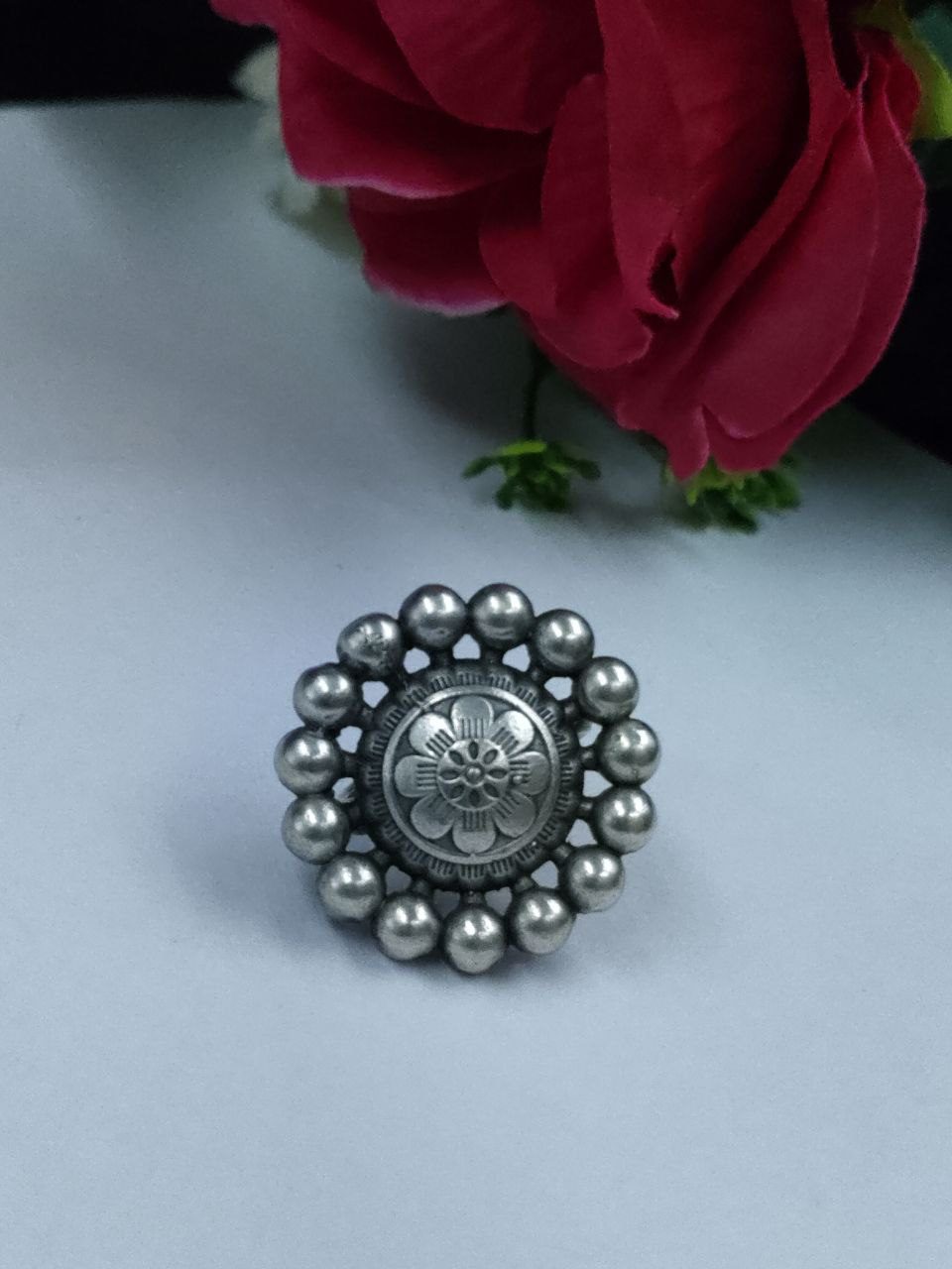 Made from premium quality metal alloy with a lasting oxidized silver polish, it is lightweight and skin-friendly, ideal for daily wear without any discomfort. Whether you’re heading to college, work, a coffee outing, or a casual get-together, this Flower Ring complements a variety of outfits?be it ethnic kurtis, Indo-western fusion wear, or even western dresses.
