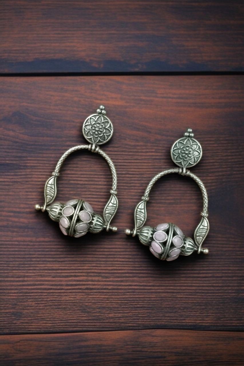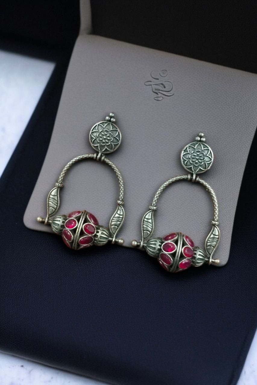 Crafted from premium quality silver-plated metal, the earrings showcase a beautifully oxidised finish that gives them a vintage and rustic appeal. The highlight of these Oxidised Dangler Earrings lies in their distinctive design, which sets them apart from conventional styles. Adorned with shimmering stones, the intricate pattern adds a subtle sparkle that draws attention without being overwhelming.