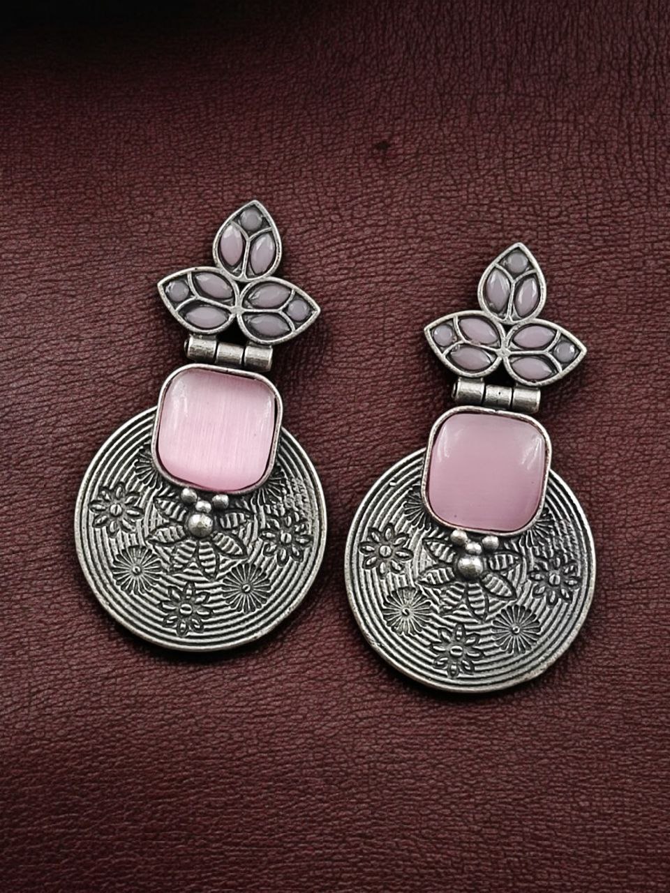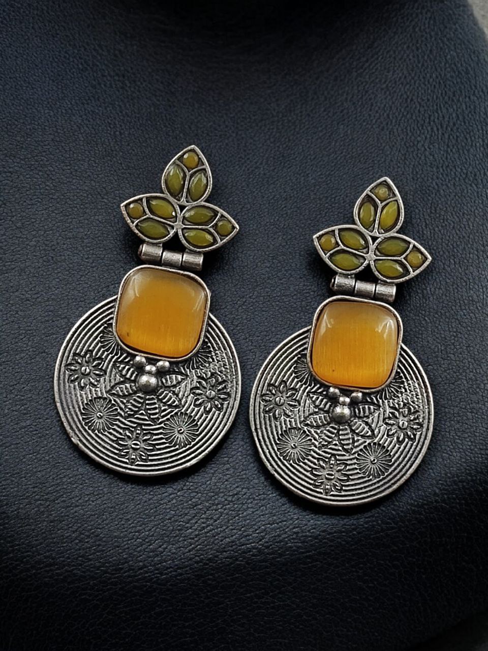 The oxidized silver replica finish gives the earrings a rich antique appeal, enhancing the depth and definition of the intricate flower design. Carefully set stones add a subtle sparkle that perfectly balances the vintage look, creating an eye-catching yet elegant piece. The unique design ensures these Flower Design Dangler Earrings stand out while remaining versatile enough for various occasions.