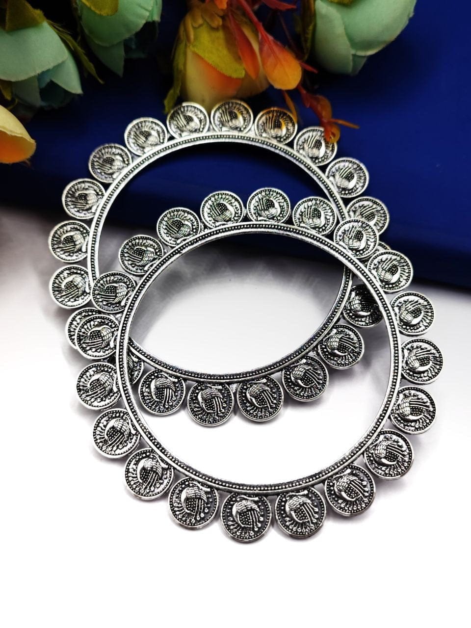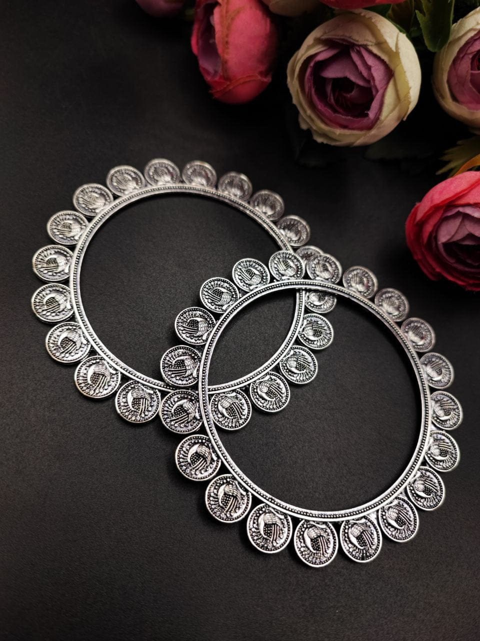 Discover the enchanting allure of our Oxidised German Silver Peacock Coin Bangle, a stunning blend of traditional design and contemporary elegance. Perfectly crafted for young fashionistas, this bangle captures the essence of cultural heritage while offering a chic and modern accessory that complements any outfit.
