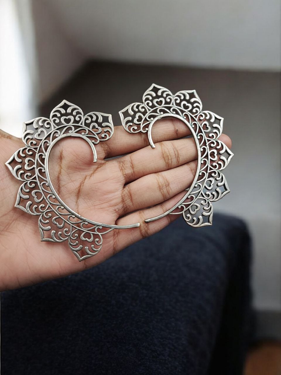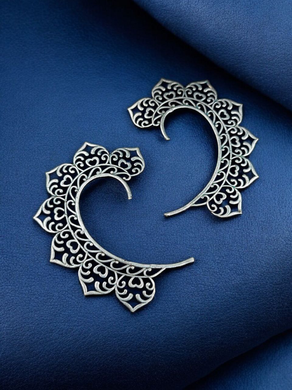 The Floral Art Earcuff features intricate floral art detailing, carefully designed to highlight fine curves, patterns, and craftsmanship. The vintage-inspired motifs give it a rich, old-world character, while the oxidized finish enhances depth and contrast, closely resembling real antique silver jewelry. Its crescent-style structure creates a dramatic and artistic look that instantly elevates any outfit.