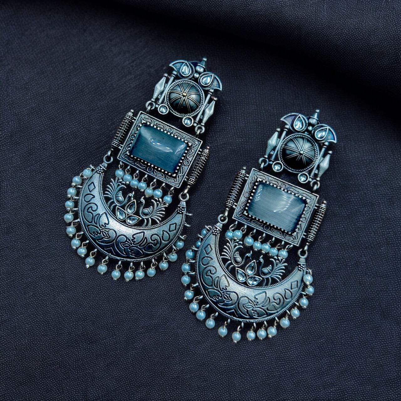 Crafted from high-quality metal with a silver replica finish, these oxidized Monalisa Stone Earrings mimic the look of authentic sterling silver without the premium price tag. The vintage-inspired oxidation process adds depth to the intricate detailing, giving them an antique aesthetic that complements ethnic and Indo-western outfits beautifully.
