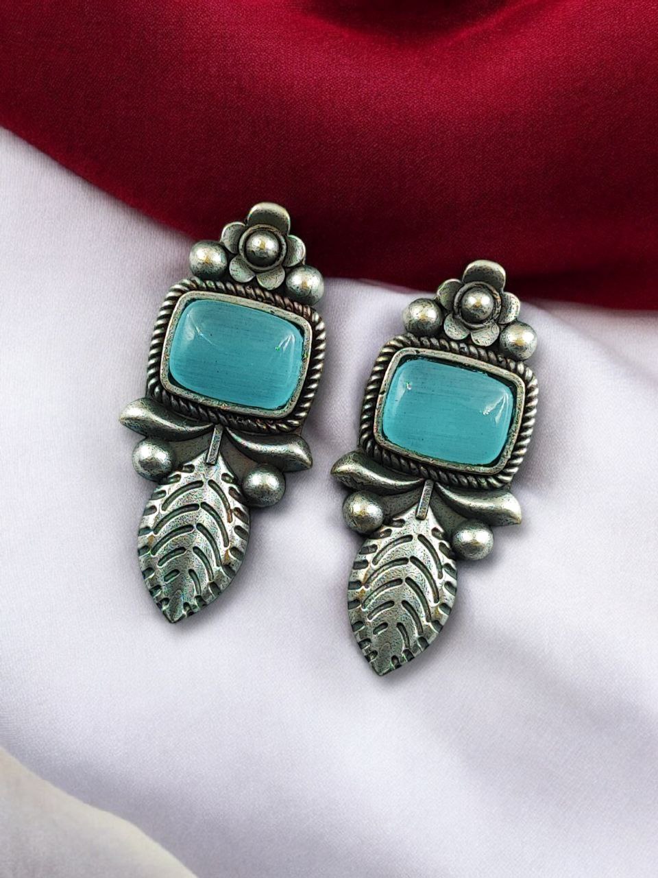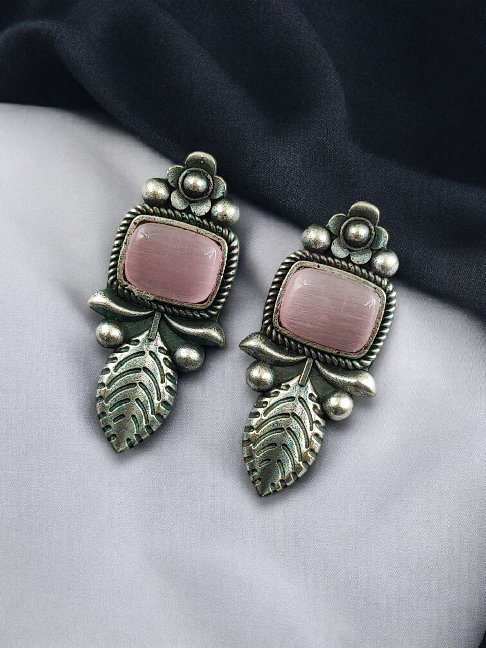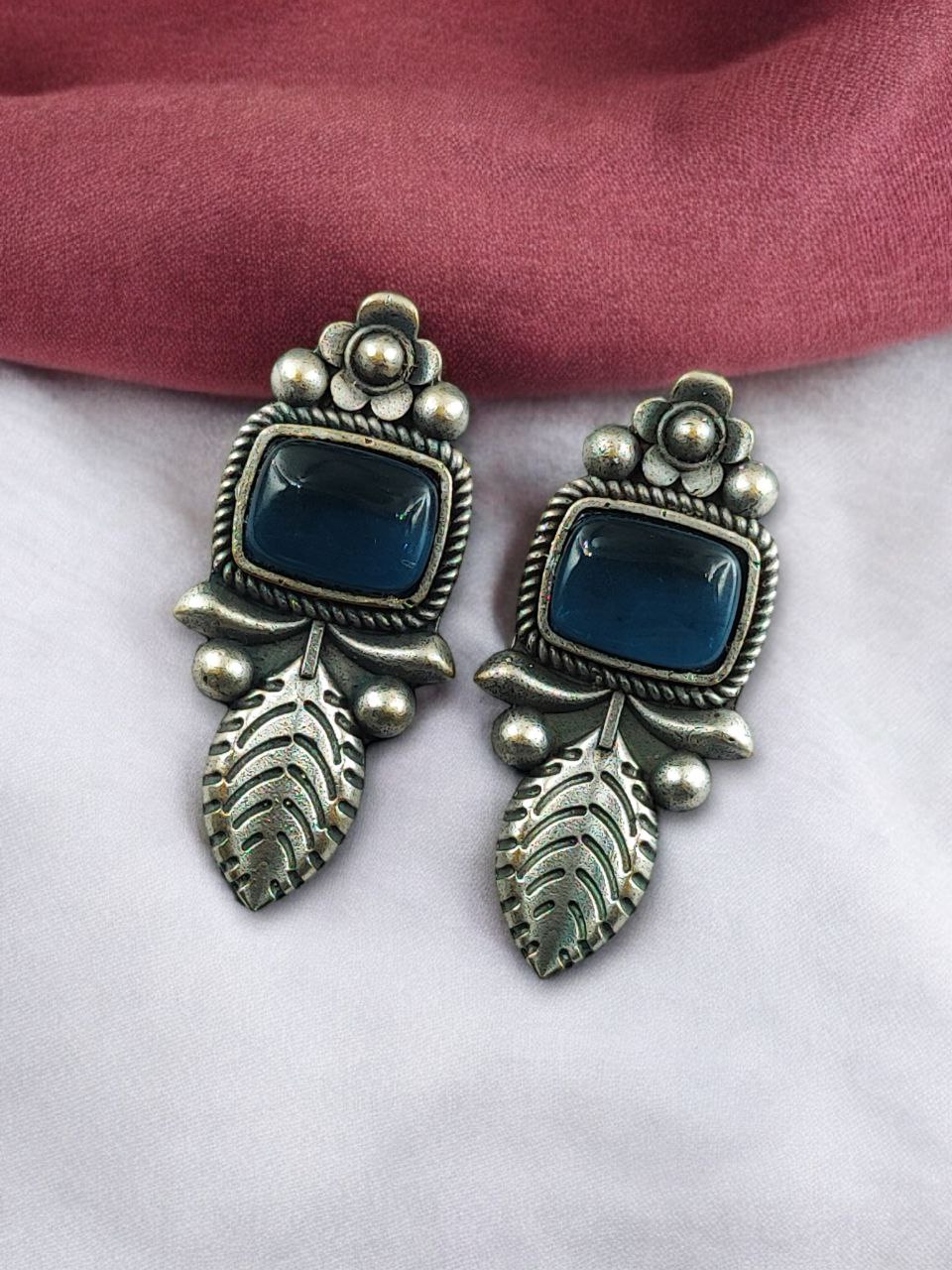 Crafted from high-quality base metal, these Leaf Design Stud Earrings feature a premium silver replica finish that gives them an antique and timeless appeal. The delicate leaf design symbolizes freshness, growth, and natural beauty, while the smooth Monalisa stone adds a soft glow and refined elegance. The vintage-inspired detailing enhances the overall charm, making these studs stand out without being heavy or flashy.