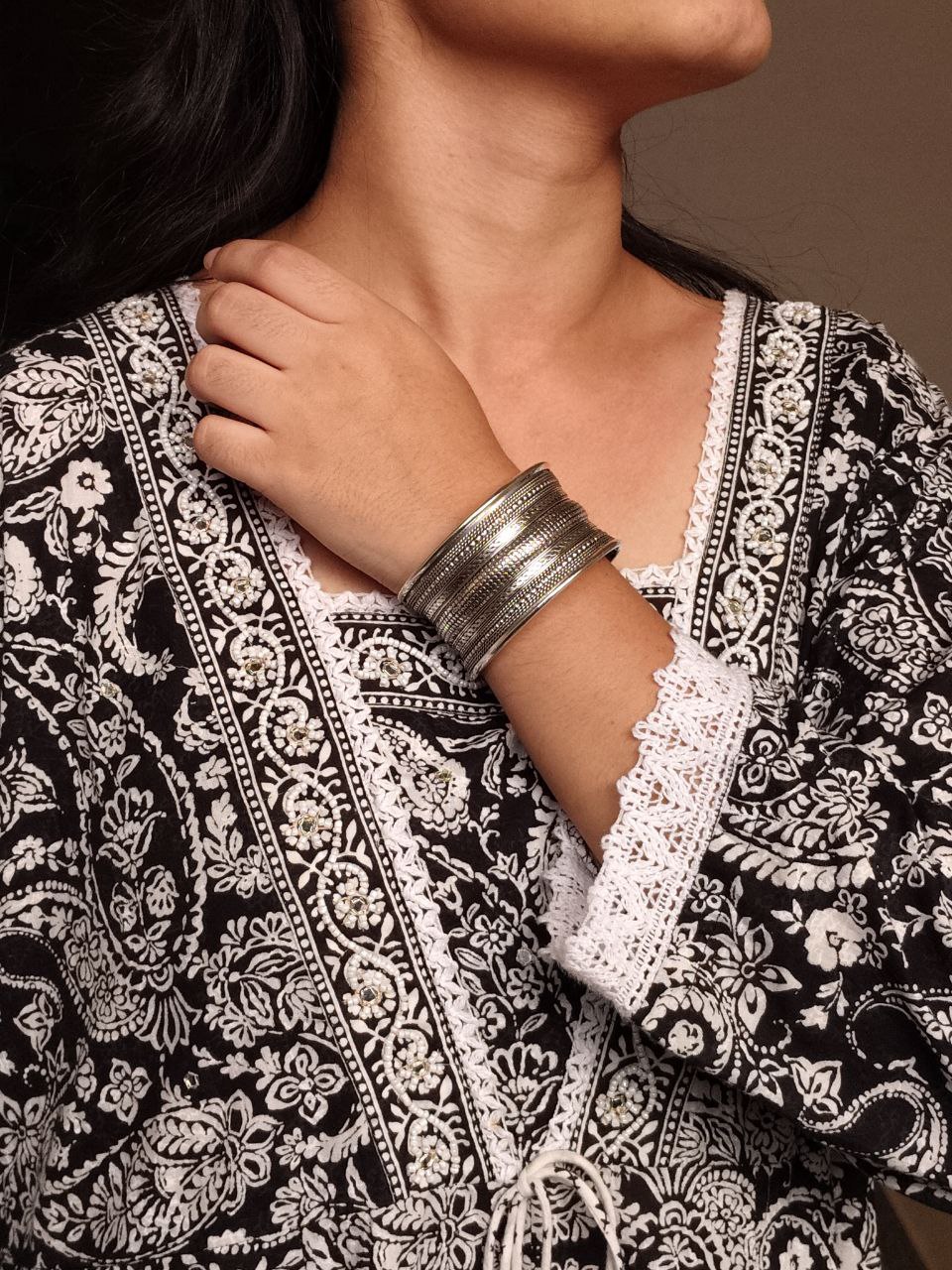 Crafted by skilled artisans, the bracelet features an intricate vintage-style design that reflects the beauty of traditional Indian craftsmanship. Each carved pattern, texture, and curve is carefully shaped to create a stunning piece that blends ethnic artistry with modern elegance. The oxidized silver finish enhances its rich, antique appeal, giving it a bold yet graceful character that stands out effortlessly.