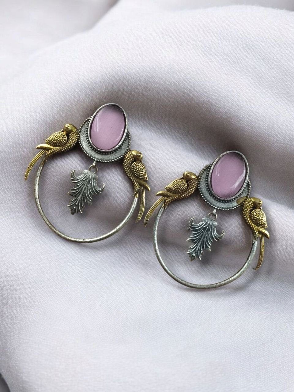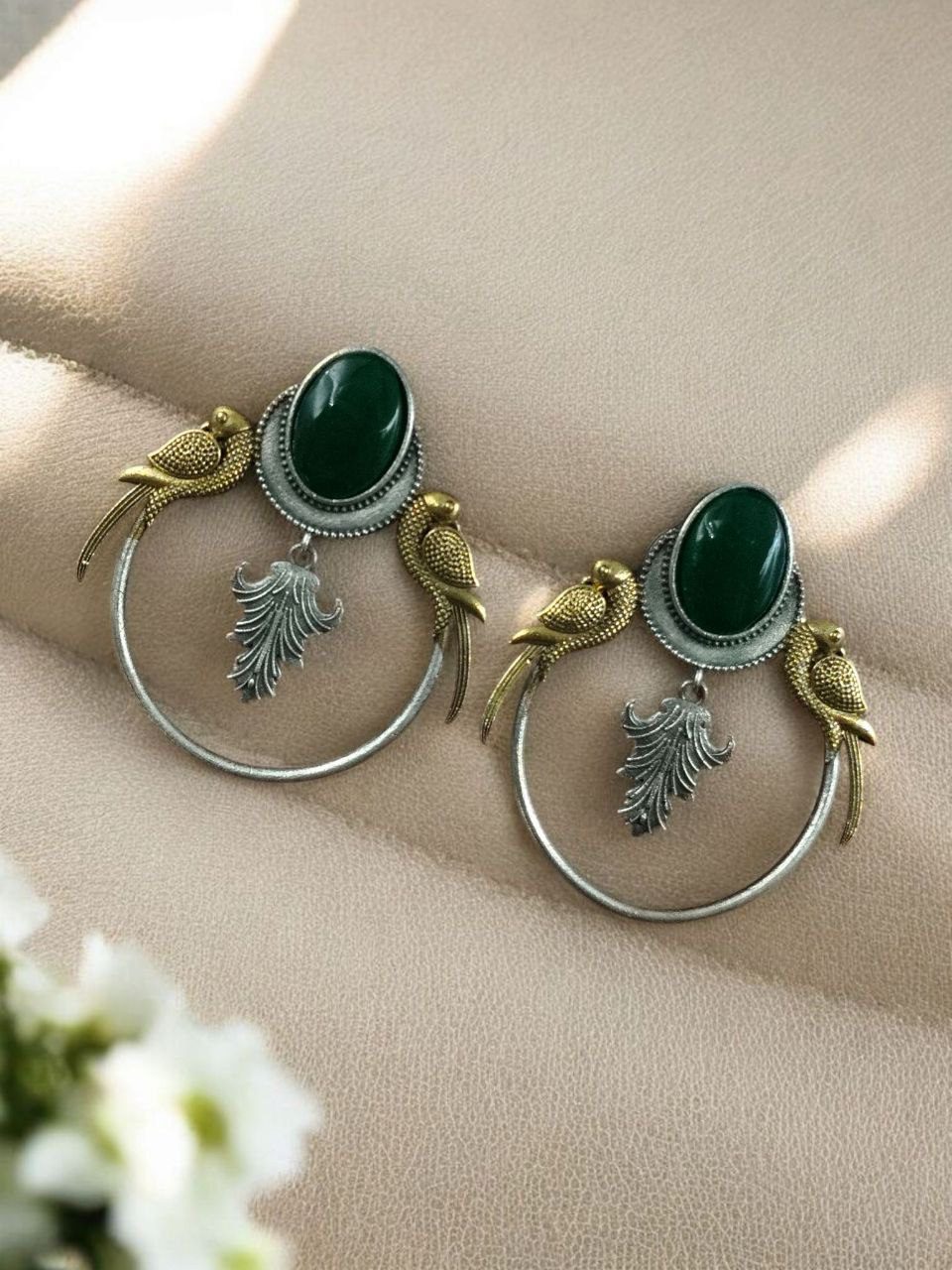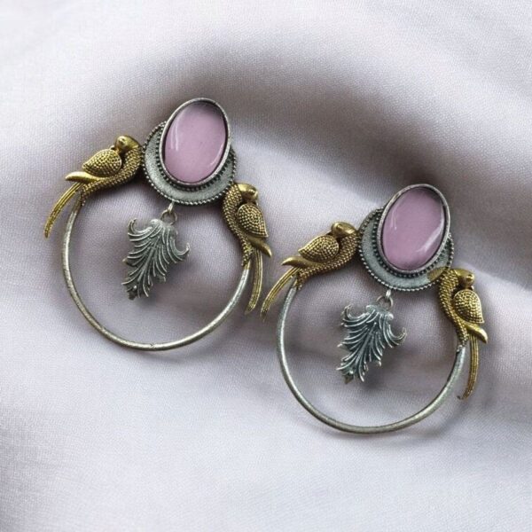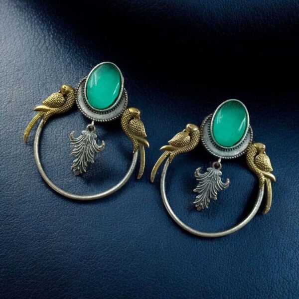 What truly enhances the beauty of these Two-Tone Parrot Earrings is the Monalisa stone, delicately embedded to offer a soft, glowing finish. Its subtle shine contrasts beautifully with the antique two-tone metal, creating a look that is both eye-catching and graceful. This combination of parrot design, Monalisa stone, and dual-tone polish makes these earrings a standout accessory for ethnic as well as fusion wear.