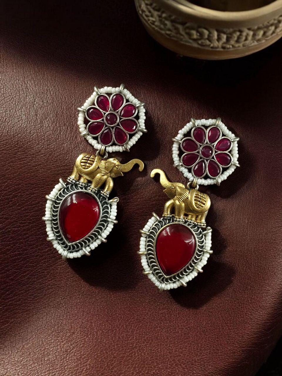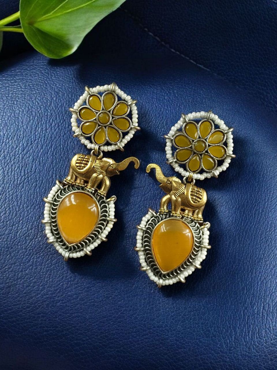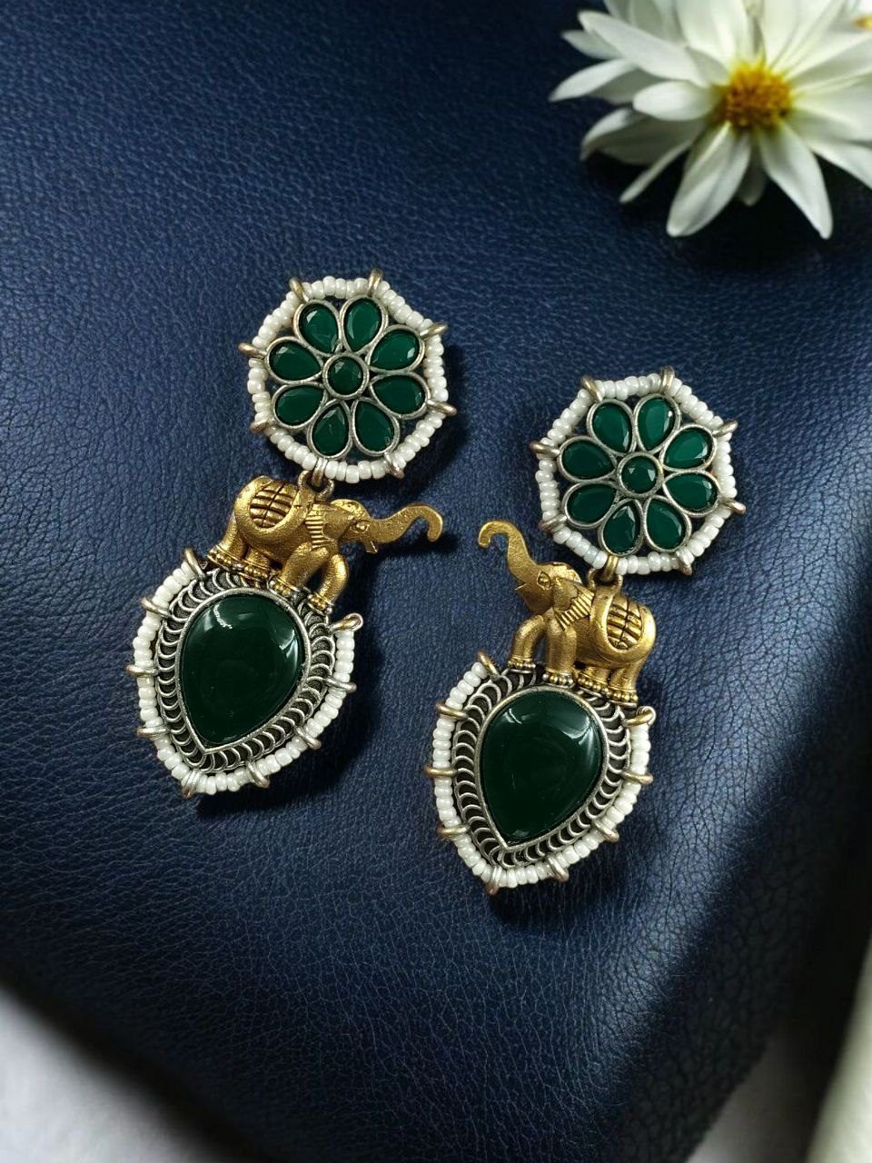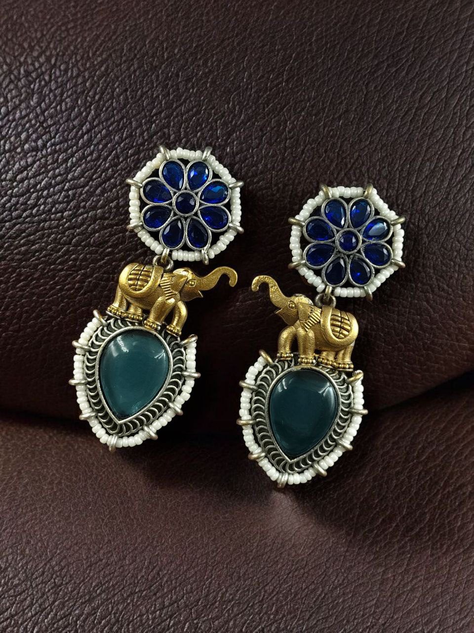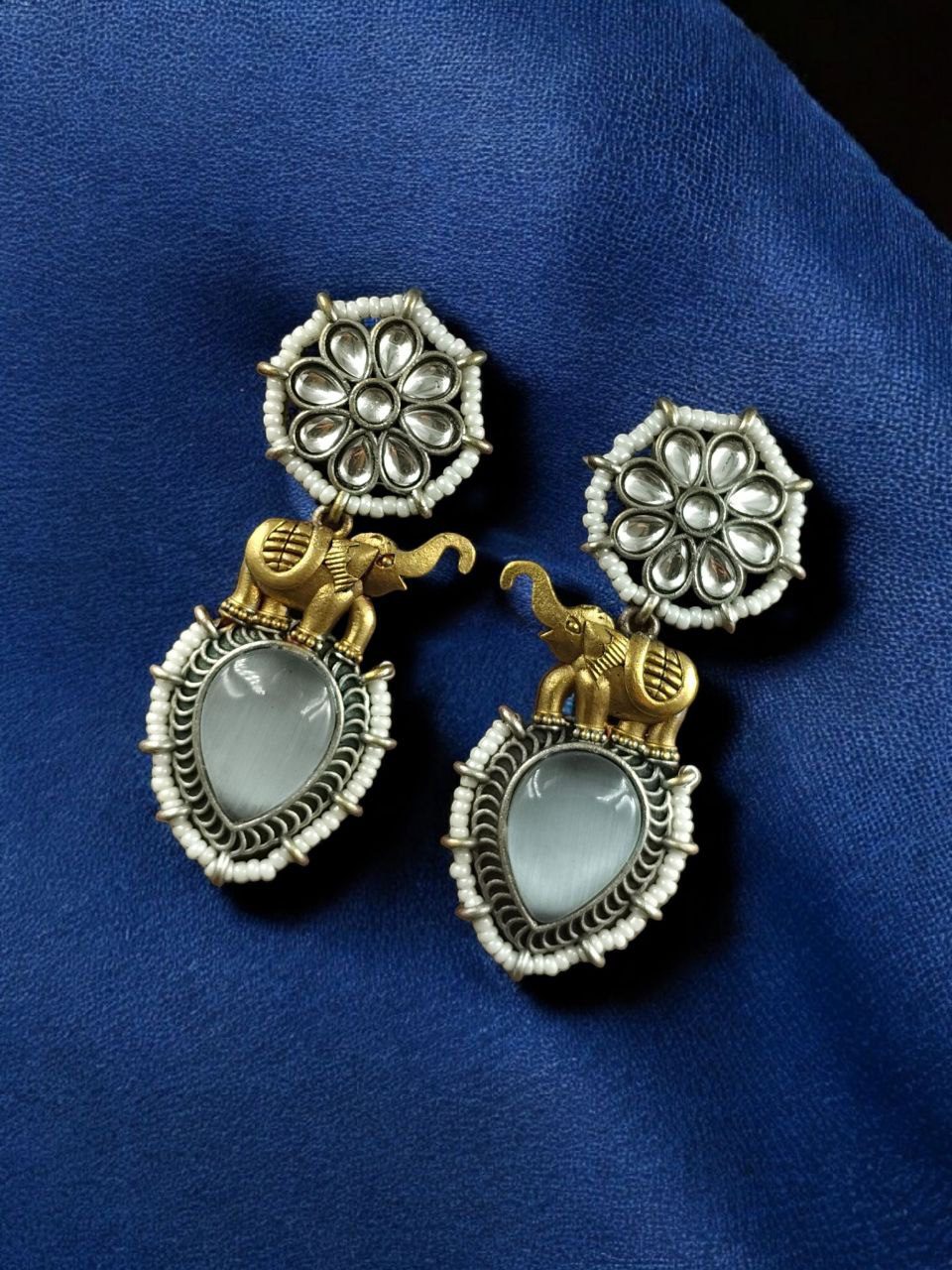 Perfect as a thoughtful gift or a statement piece for your own collection, these earrings suit women of all age groups who admire ethnic artistry with a modern twist. The blend of two-tone polish, elephant charm, floral detail, Monalisa stone, and pearl accents makes this pair a true work of art.