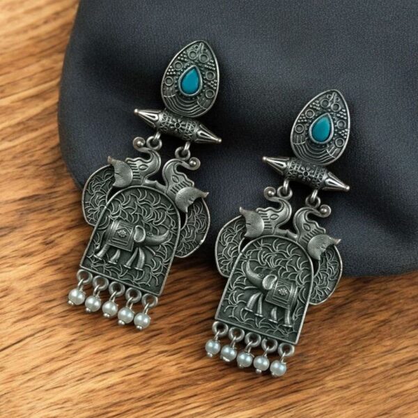 Traditional Oxidized Elephant Earrings | Best Silver Finish Dangler with Stone & Pearl Work